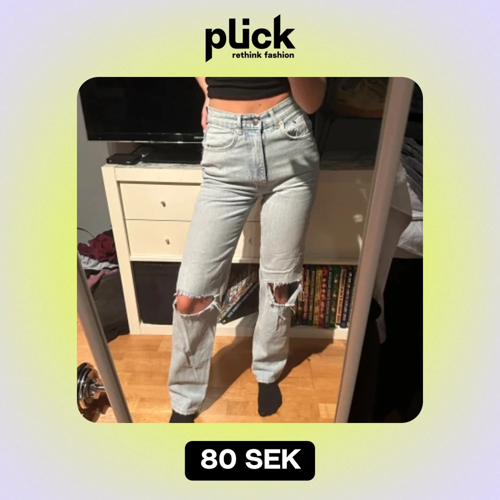 Raka, högmidjade jeans med hål på knäna från Gina. Har sytt in lite vid höfterna för en tajtare passfor men det är inget som stör❤️