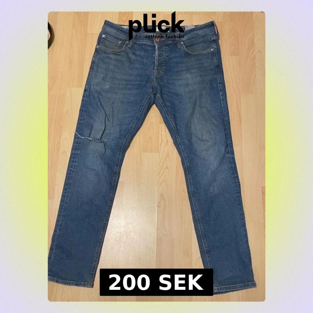 Snygga blå jeans från Jack & Jones i modellen Slim Glenn. Jeansen har en slim passform, klassisk femficksdesign och en liten sliten detalj på vänster ben. Tillverkade i mjukt denimtyg med en mellanblå tvätt och subtila slitningar.