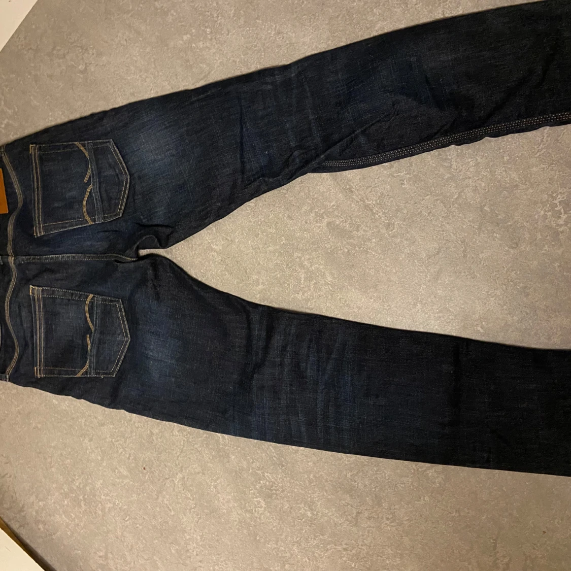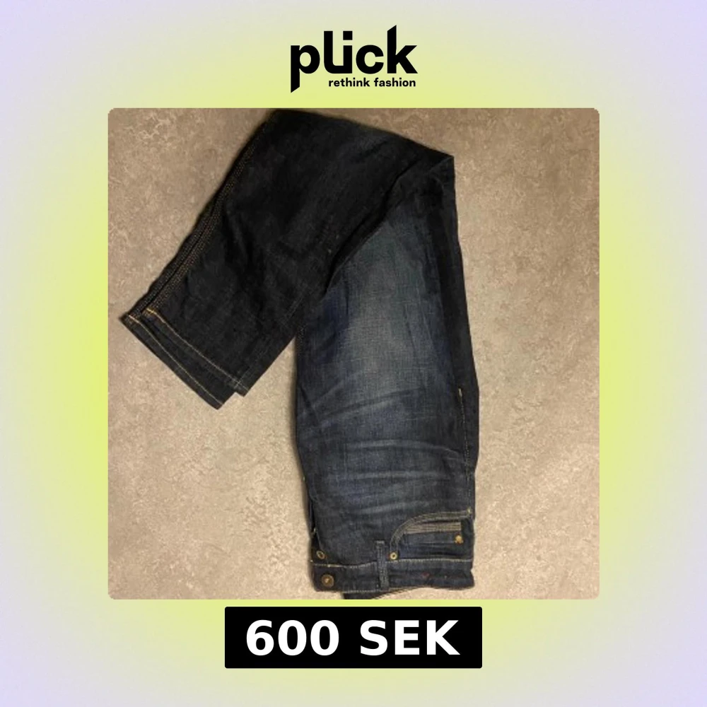Snygga mörkblå jeans med klassisk femficksdesign och kontrastsömmar. Perfekta för en avslappnad stil eller den så kallade grisch stilen, de har en slim passform och benslutet tajtar ihop sig. De har en knappgylf och är tillverkade i ett slitstarkt material. Pris går att diskutera!