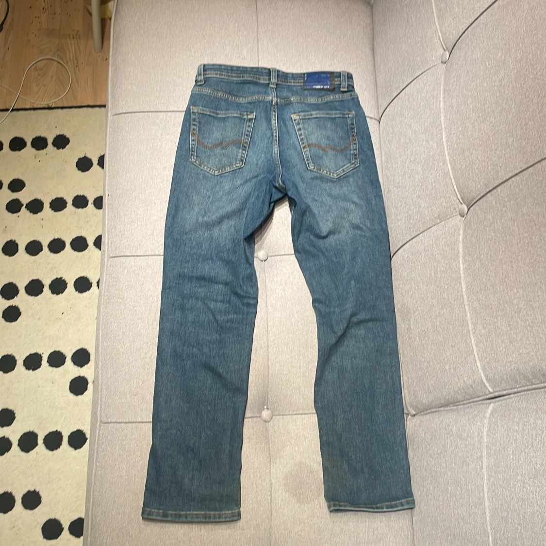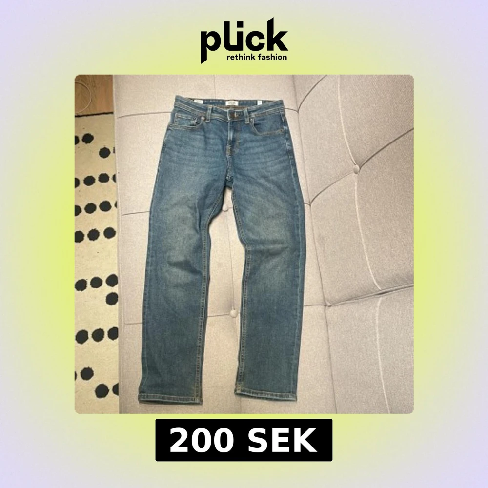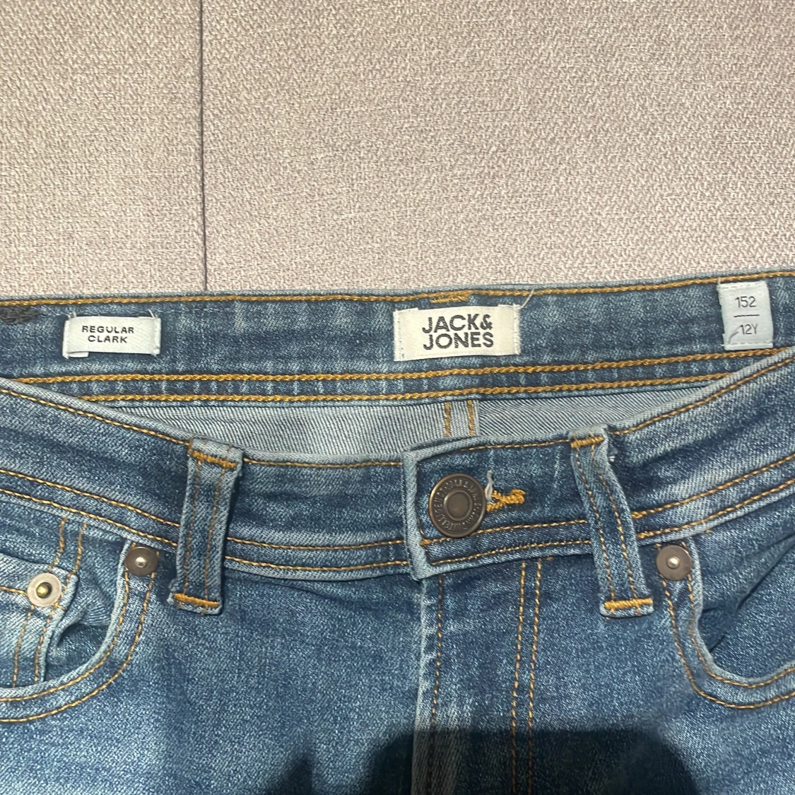 Snygga blå jeans från Jack & Jones. De är i storlek 12 år/152 och är i 7/10 skick de är sparsammt använda. Lappen är lite skadad, se på bild 3. Pris kan diskuteras!