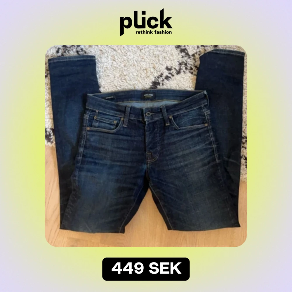 Mörkblåa Jack and Jones jeans i nyskick. Modellen heter Glenn och är slimfit. Det är storlek 29/32 och jeansen är extremt stretch.
