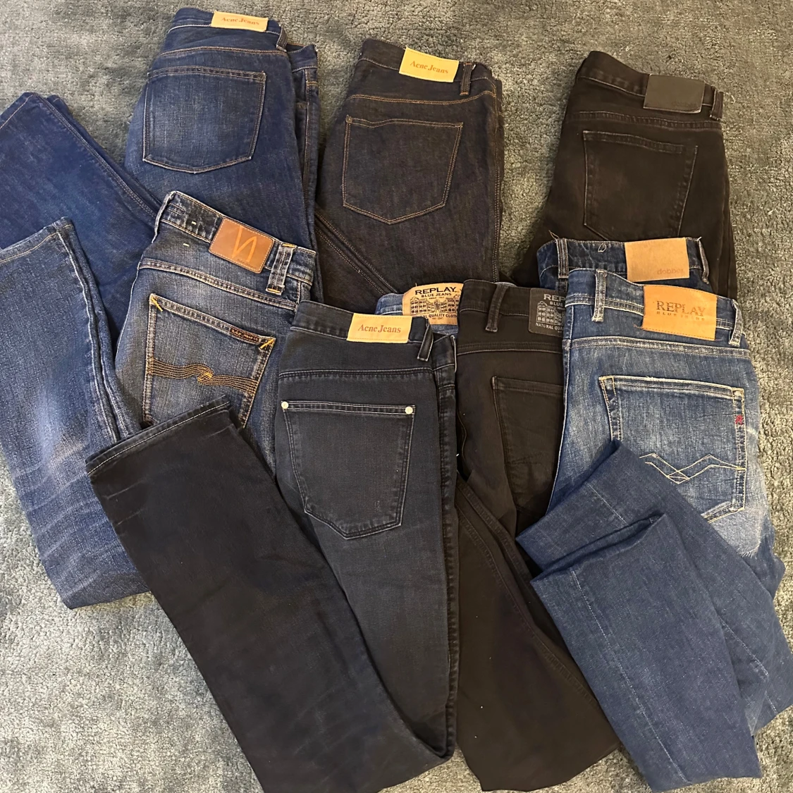 Tja! Säljer en jeans bundle som består av: 2 par Replay jeans | 3 par vintage acne jeans (nästintill omöjliga att få tag på)| 1 par nudie jeans | 2 par Dobber jeans | skriv privat angående frågor! OBS desto fler du köper desto billigare🙌
