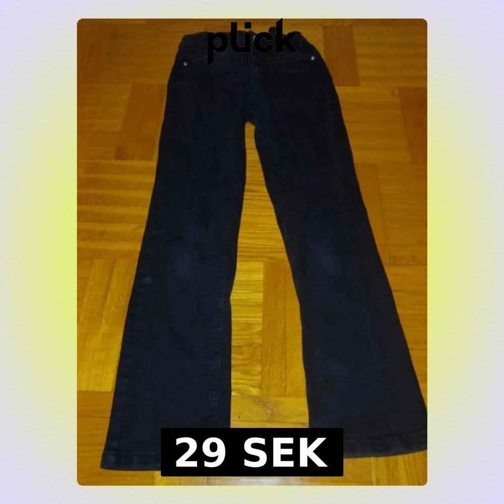 Säljer ett par mörkblå jeans med bootcut passform och klassiska fem fickor. Byxorna har justerbar resår i midjan för extra komfort och silverfärgade nitar. Materialet är jeans och färgen är riktigt mörkblå, perfekt till sneakers eller boots.