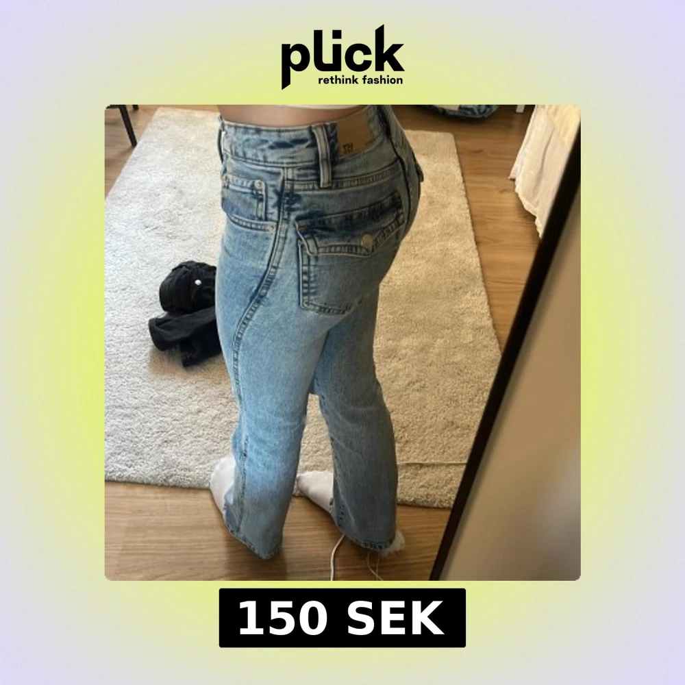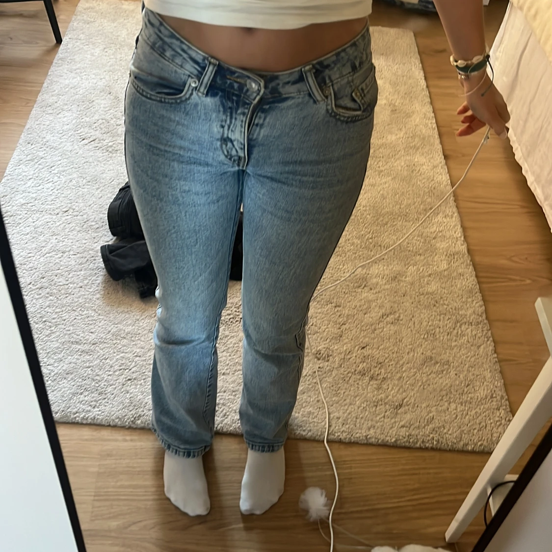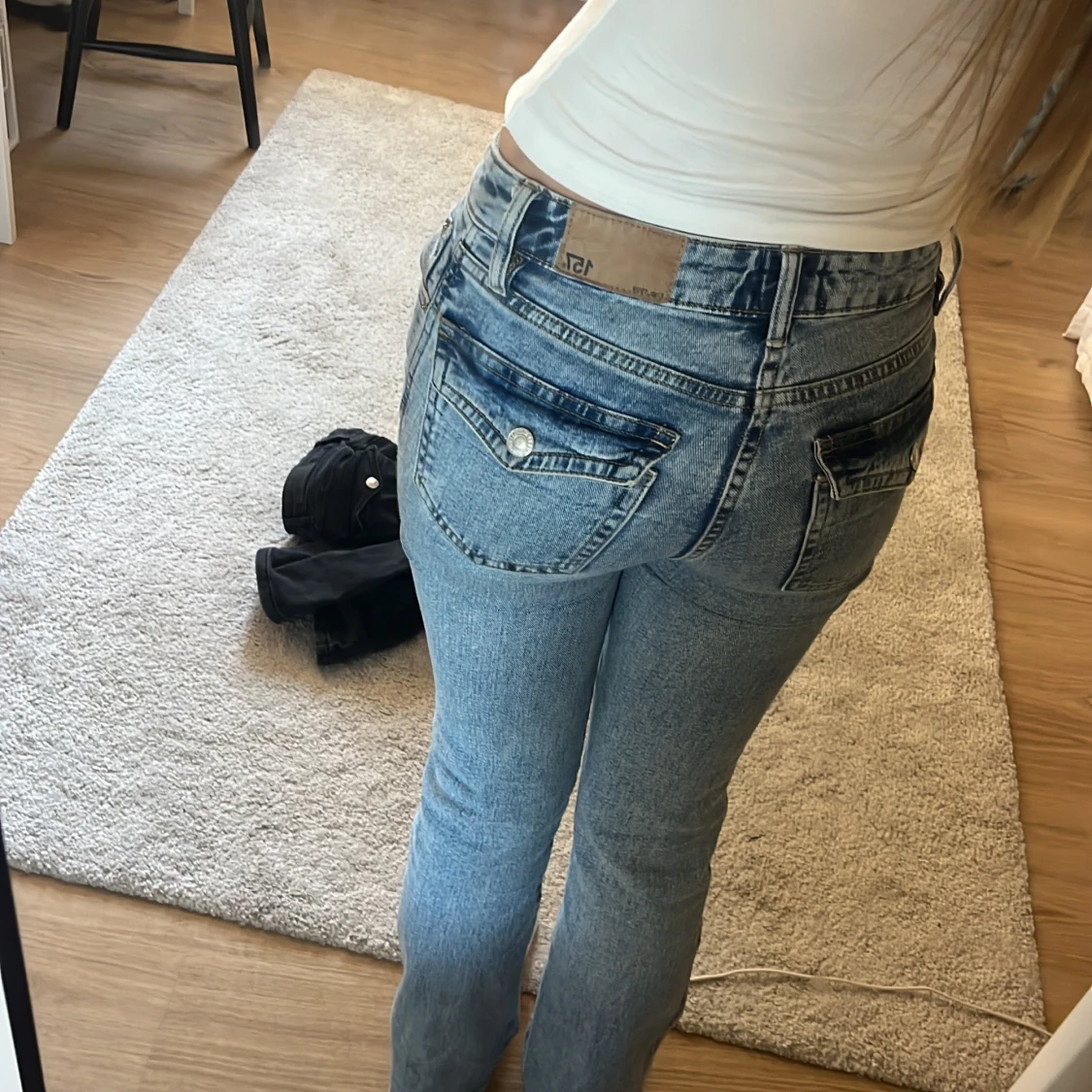 Säljer ett par ljusblå bootcut jeans från lager!! Dem är för små för mig(jag är ca 163-164cm) skulle passa någon som är 155-161cm! Sitter väldigt fint på än💗 ordinarie priset- 400kr. 😊