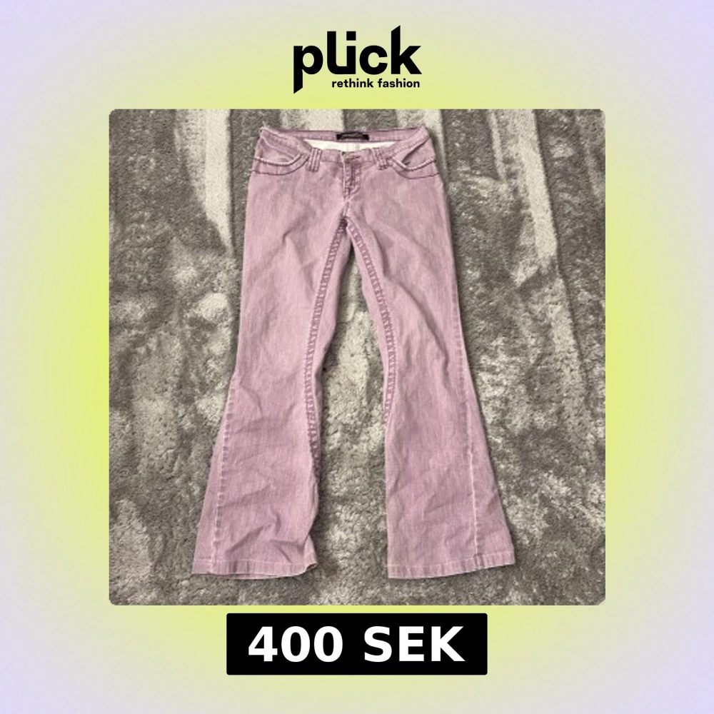 Snygga lila bootcut jeans med låg midja och klassiska femficksdesign. Byxorna har dekorativa sömmar och knappar på bakfickorna. De är tyvärr för små för mig därav säljer jag.☺️