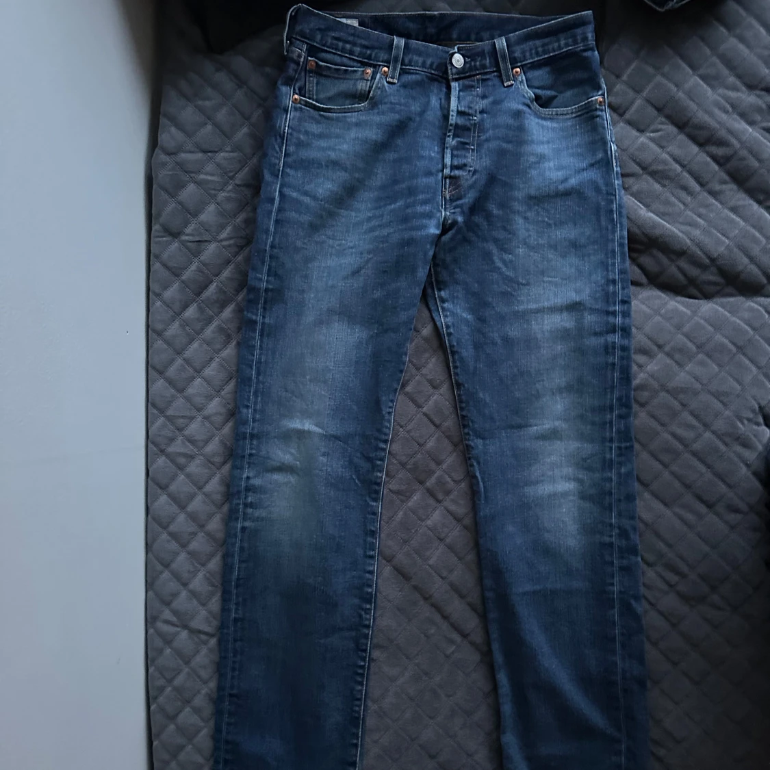 Säljer ett par klassiska blå jeans från Levi's med en snygg tvätt och femficksdesign. De har en normal passform och är perfekta för en avslappnad stil. Märkeslappen i brunt läder sitter på baksidan av midjan. Pris 199