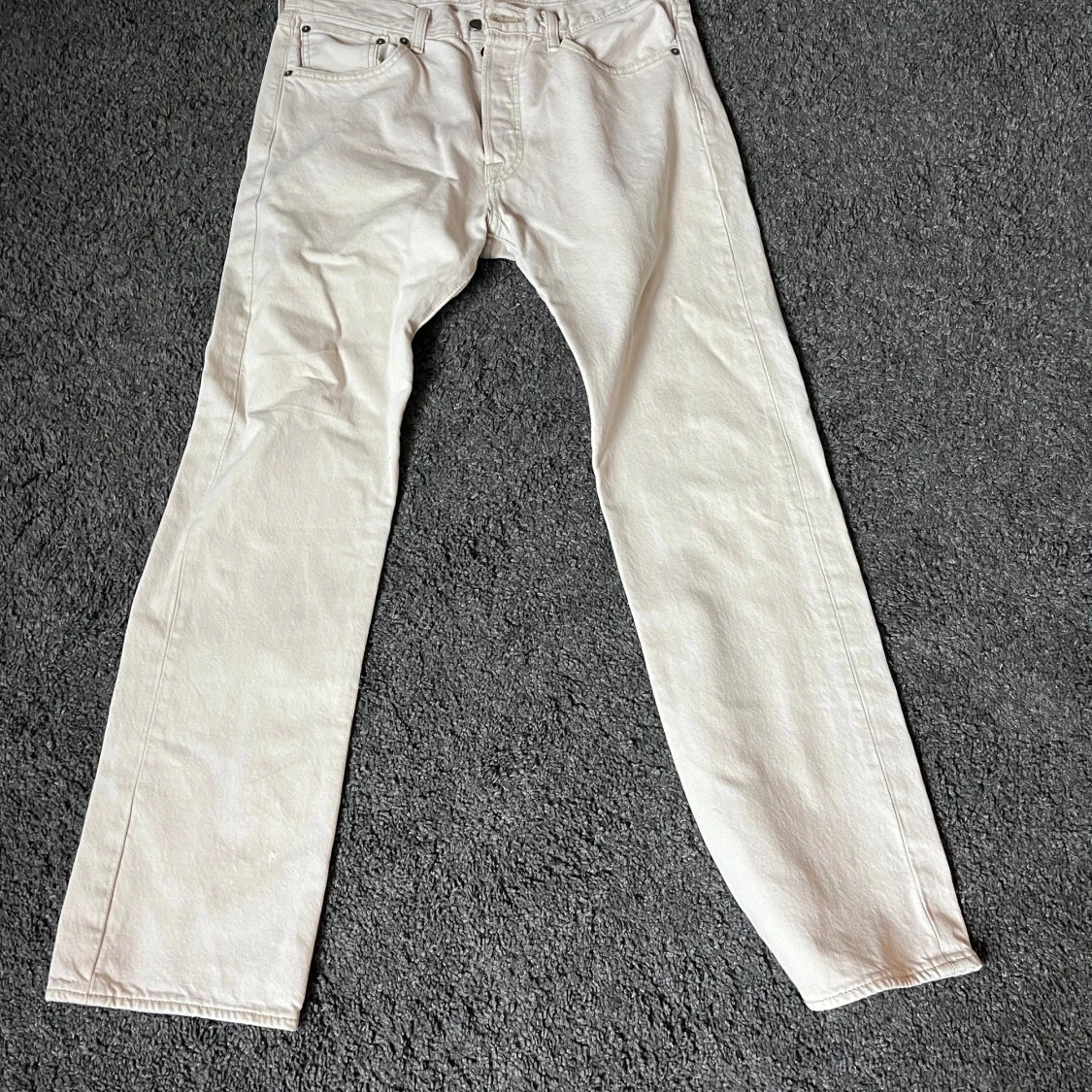 Säljer ett par klassiska beige Levi's 501 jeans med raka ben.