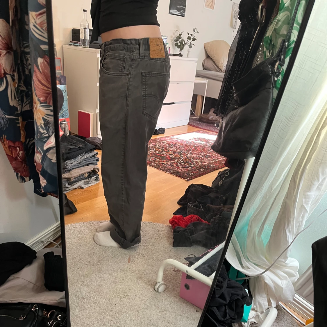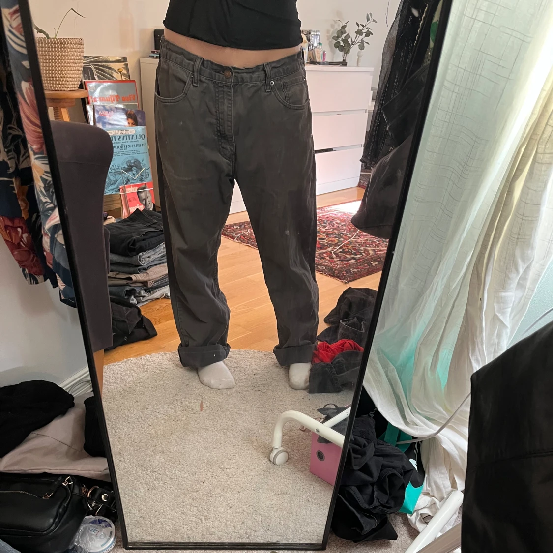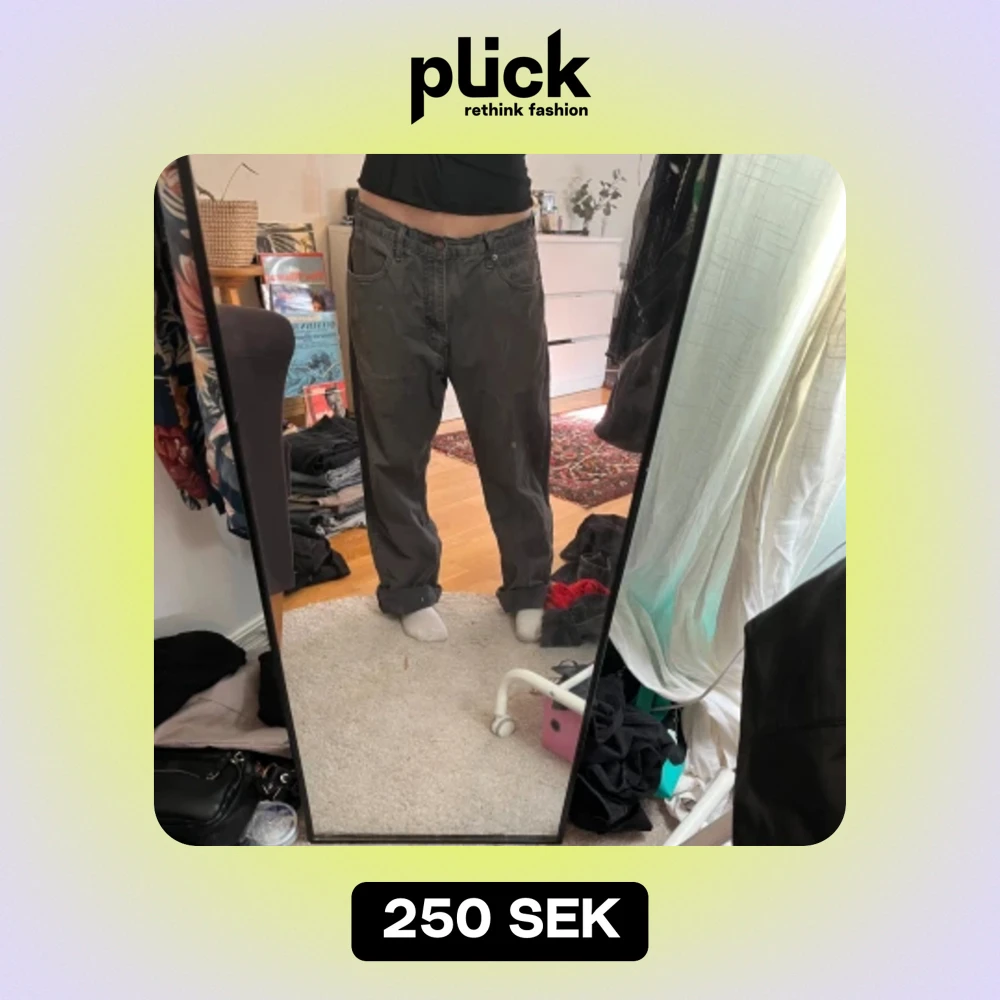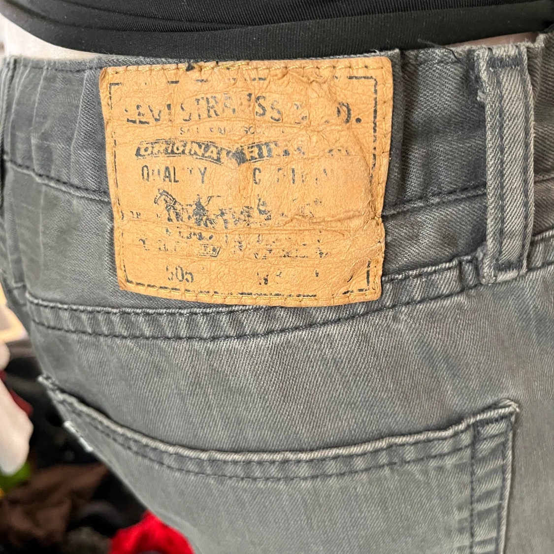 Köpta secondhand för något år sedan, har ett elastiskt band i midjan som satts dit av tidigare ägare men går att ta bort om man vill. Sitter med bandet bra på mig som har 36-38.