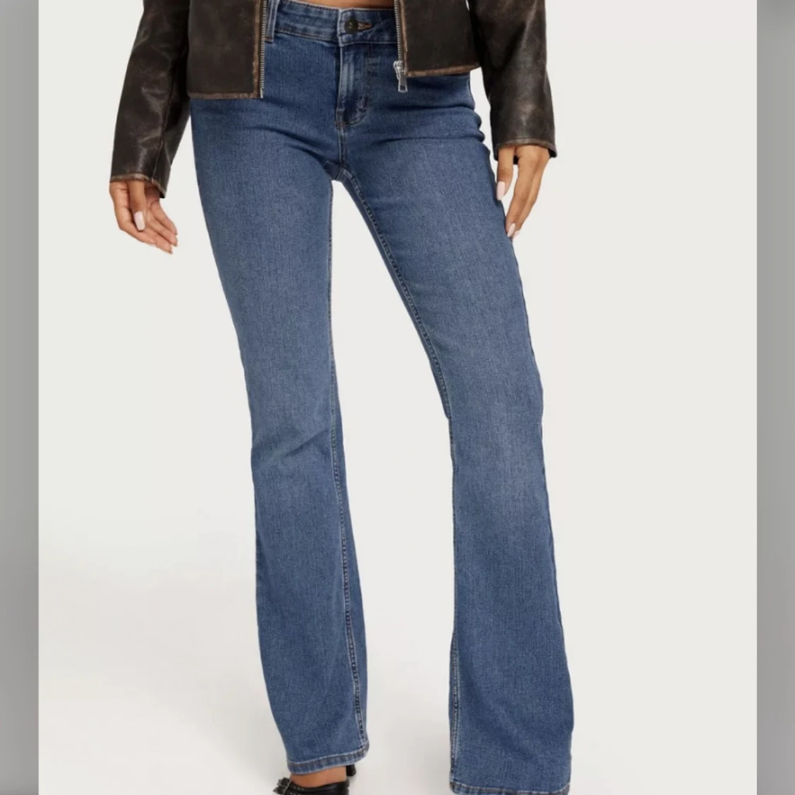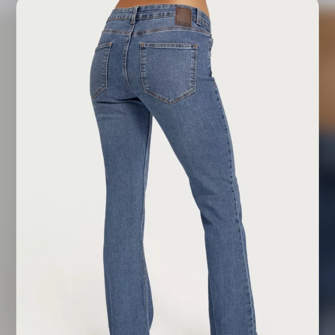 Blåa low waisted jeans 💕 De är i storlek Xs men passar även S Ordinarie pris var 350! Jag är 163, de gör över skorna men släpar inte i marken