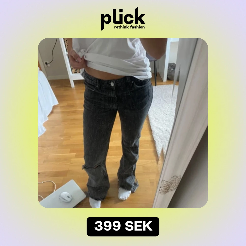 Svarta/ mörk grå jeans från gina tricot. De är midwaist och har lite slitningar i designen💗Jag är 170