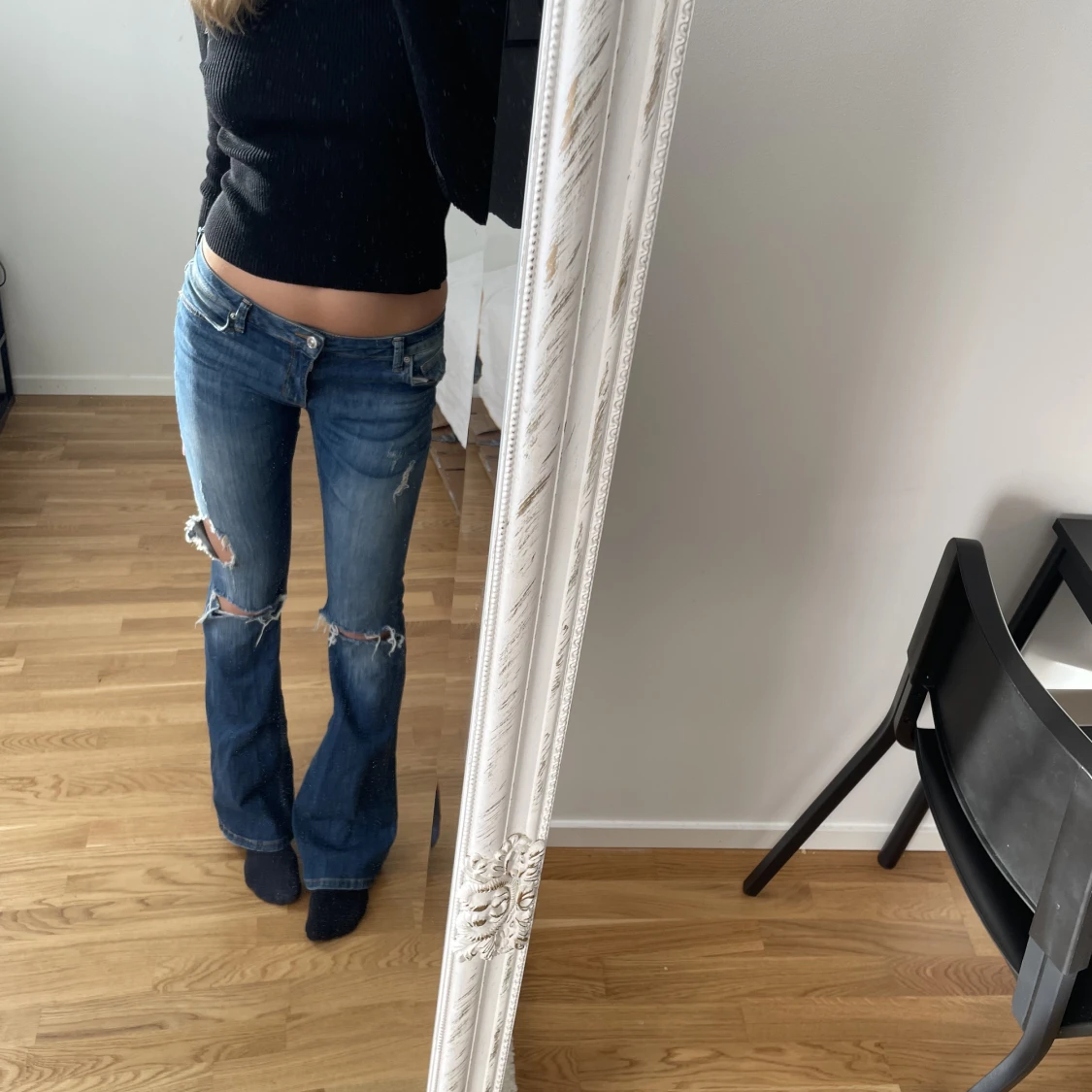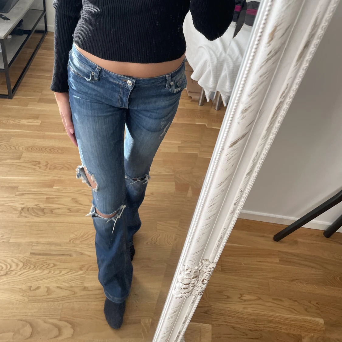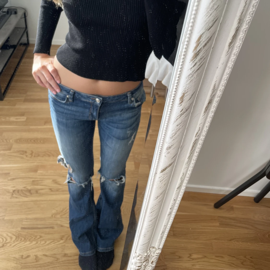 Lågmidjande, bootcut jeans. Jag är ca 170 cm. På lappen står det 38, men jag skulle säga att dom är små i storleken och är mer är XS-S. Vilket är den stil jag har vanligtvis.