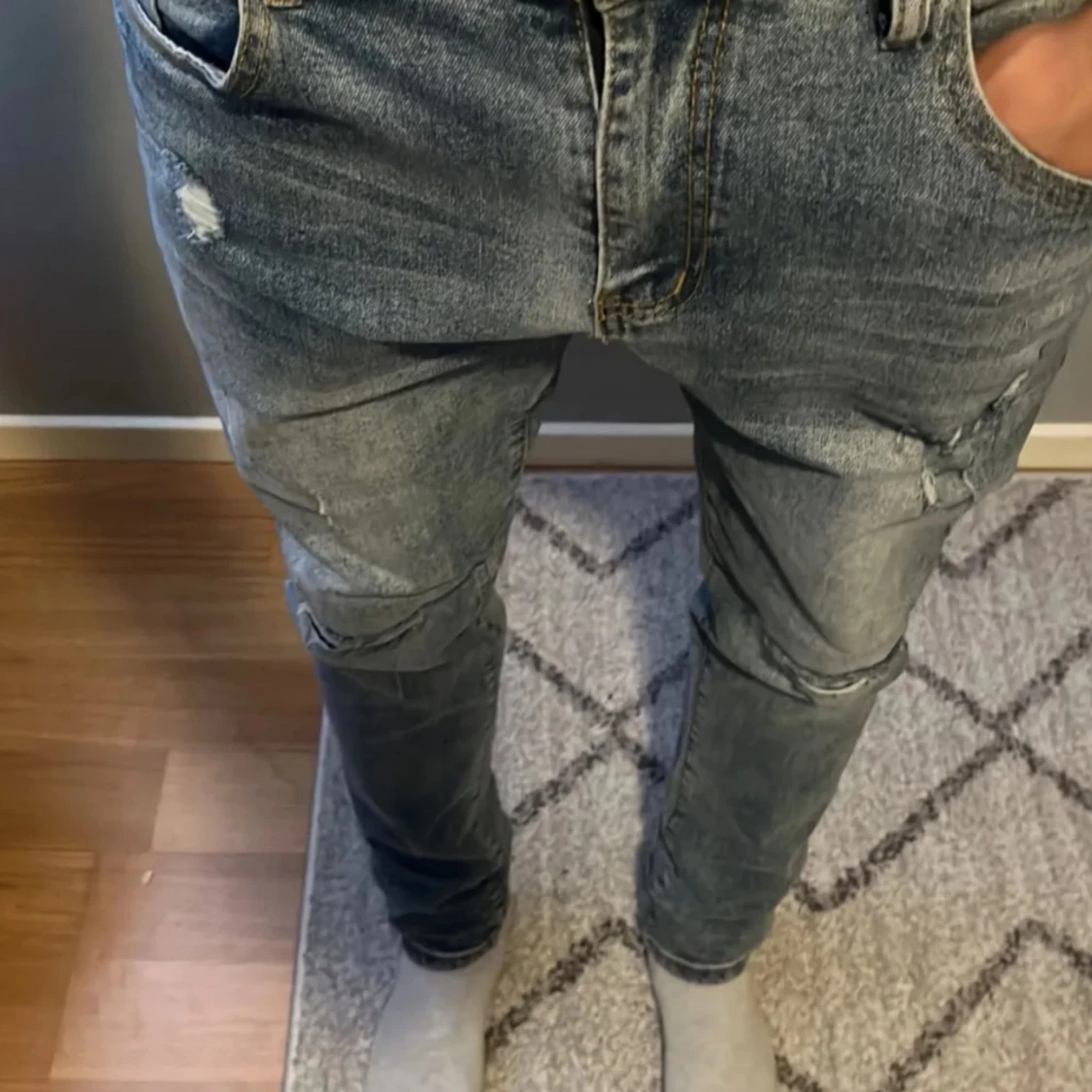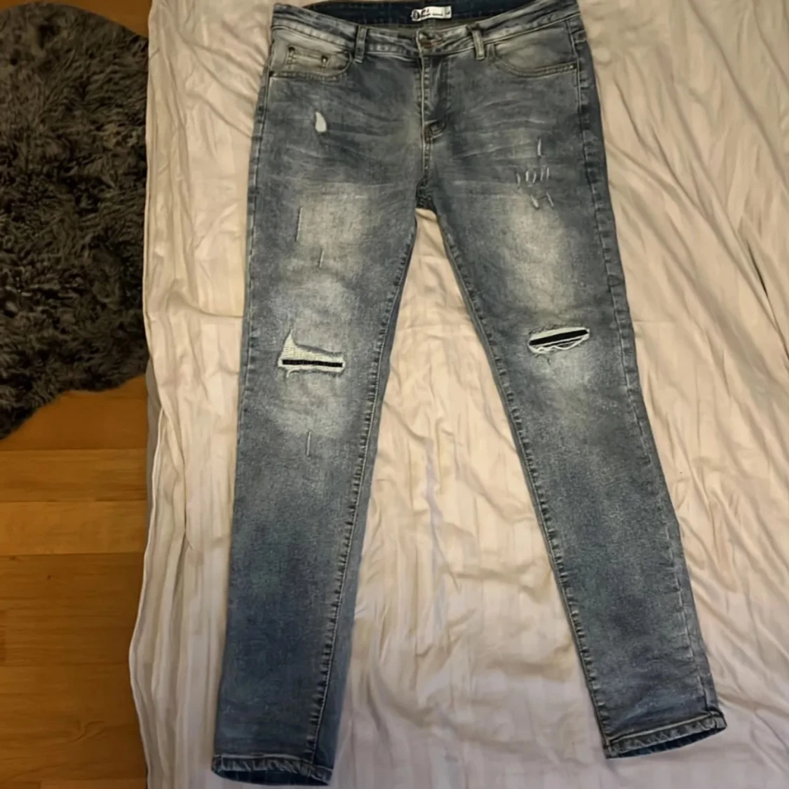Säljer ett par tvär feta jeans me slitningar på bägge ben. Jeansen har storlek 32/32 och är slimfit. Riktiga trendiga och feta. Vid frågor och funderingar är de bara att höra av sig