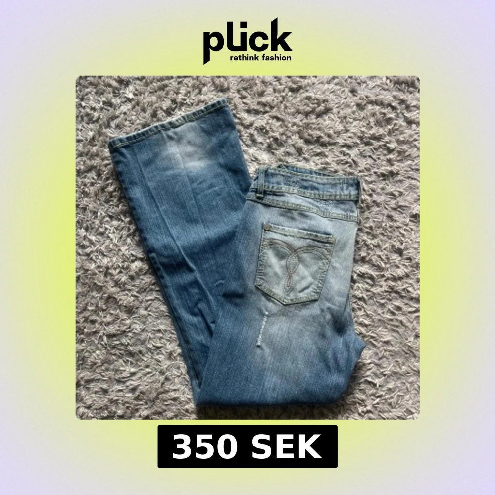 Lågmidjade jeans med massa söta detaljer som saknar både märke och storlek. Midjemåttet är 40 cm tvärs över och innerbenslängden är 74 cm!💕