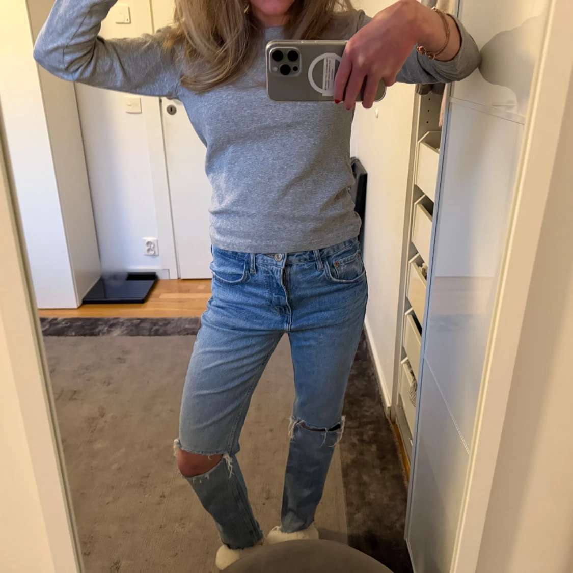 Säljes dessa jeans med hål mid waisted! Super coola storlek 36