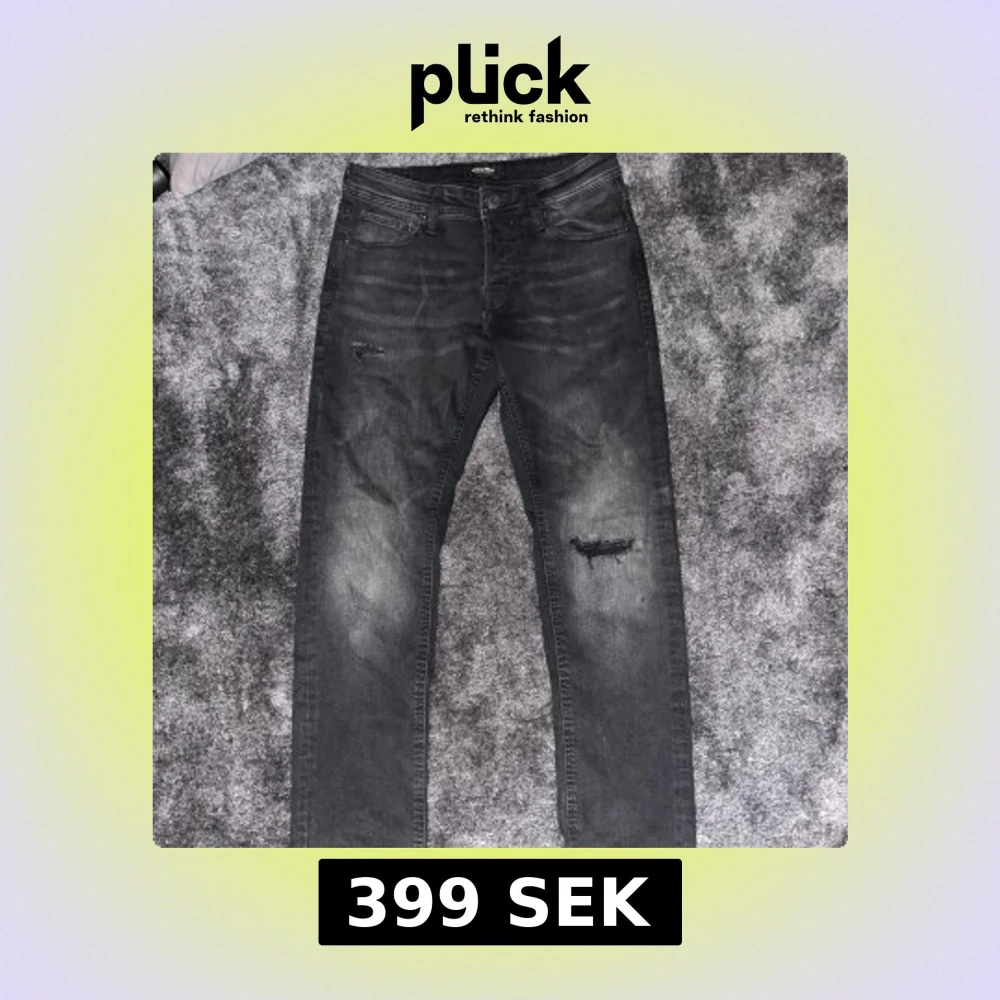 Säljer ett par svarta jeansbyxor från Jack and Jones med slitningar på låret och knät. Jeansen har klassisk femficksdesign, och en snygg tvättad look. Perfekta för dig som gillar snygga jeans, modellen är Slim/Glenn och storlek 29/30. Hör av dig om du har funderingar😁