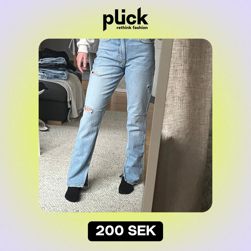 Säljer ett par ljusa jeans i mycket bra skick. De har medelhög midjade och har en straight passform. Jeansen har coola slitningar på knäna och är perfekta för en avslappnad stil. Passar bra till både vardag och fest!