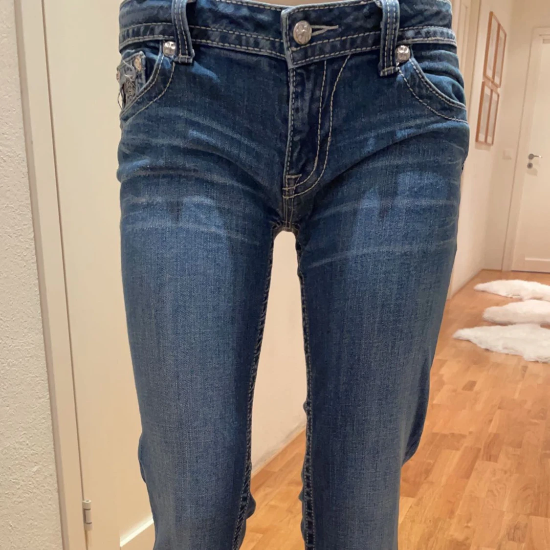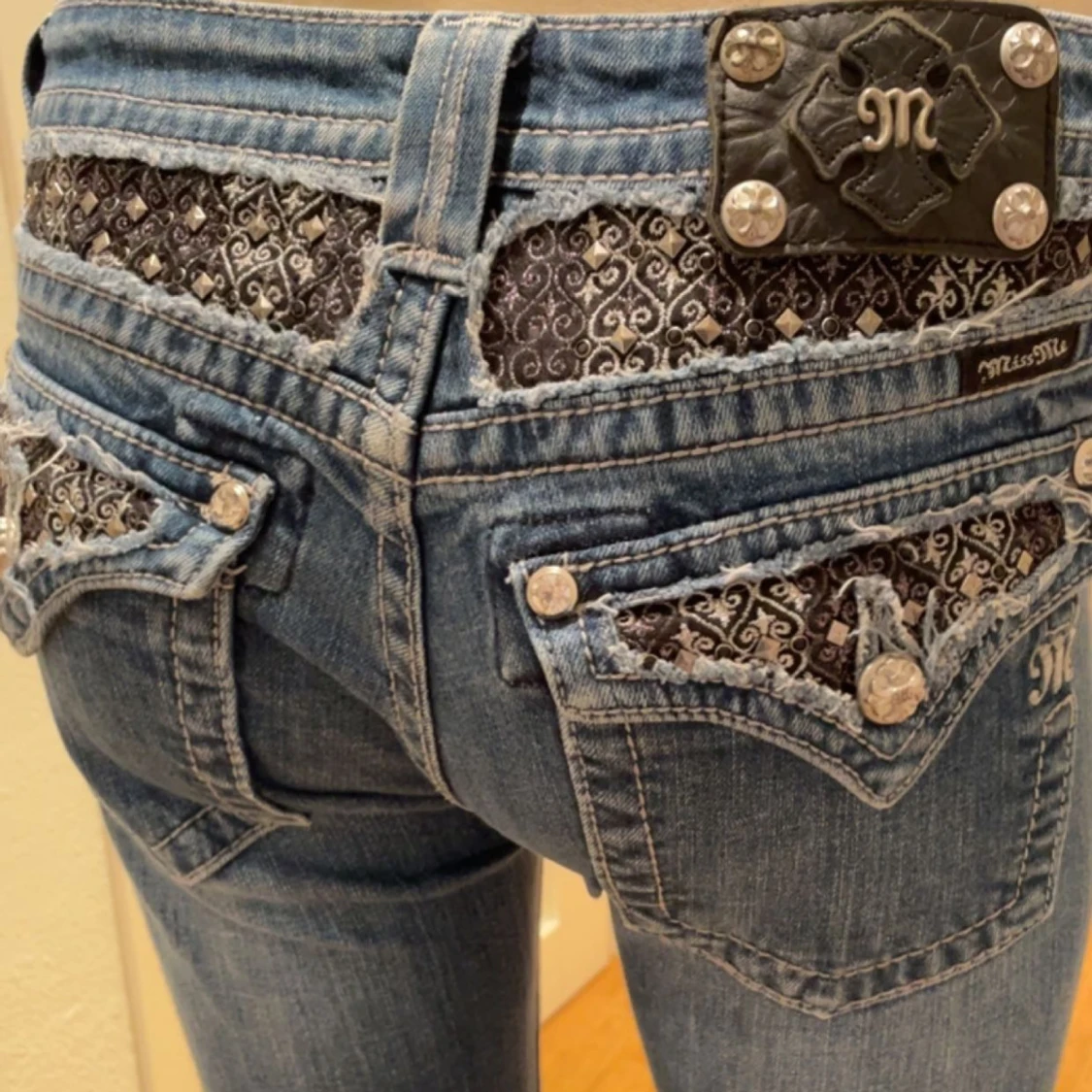 Lågmidjade bootcut jeans från Miss me. Unika fickor med snygga färger, fint skick. Innerbenslängd: 80cm. Midjemått rakt över: 39 cm. Midjemått: 85 cm. Skriv gärna vid frågor eller prisförslag💗