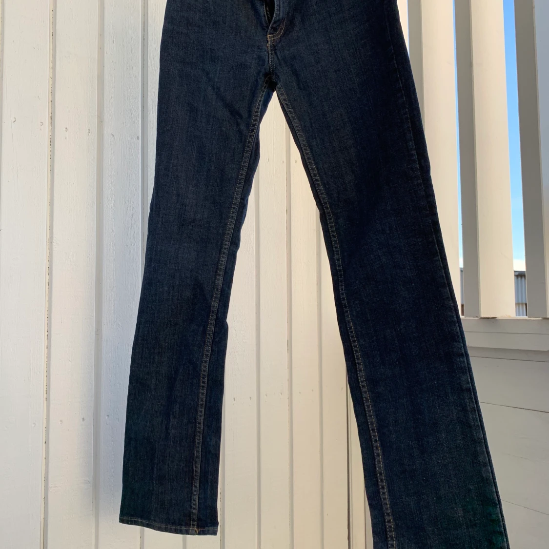 Jättesnygga lågmidjade raka, lite utsvängda mörkblåa jeans💙💙