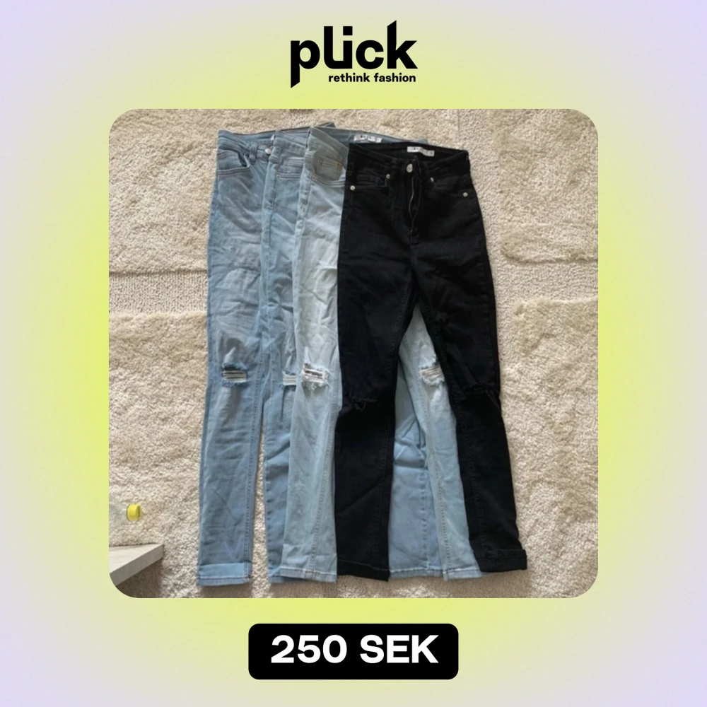 Säljer 4 paj oanvända jeans från nakd storlek xs/34 alls i samma modell, hål vid knäna, lätt stretchiga. Man får alltså alla 4 par.