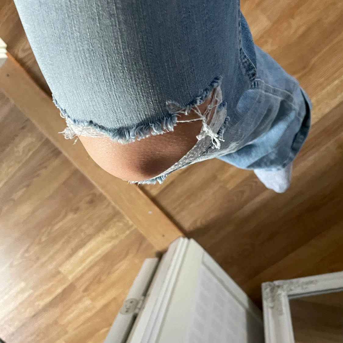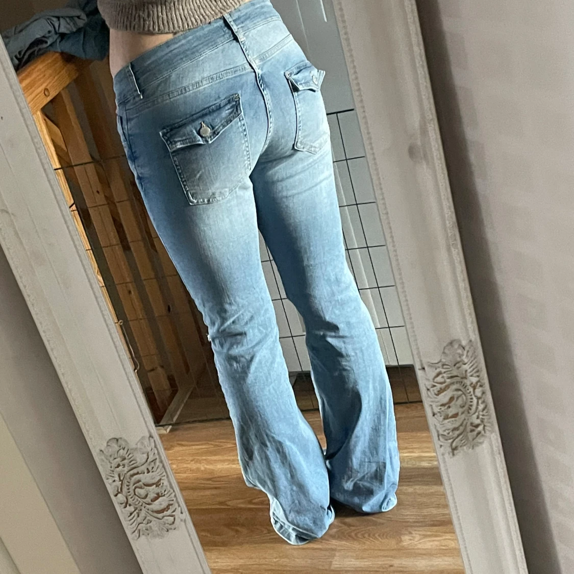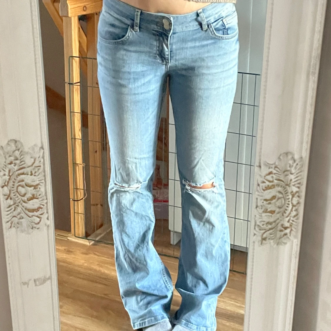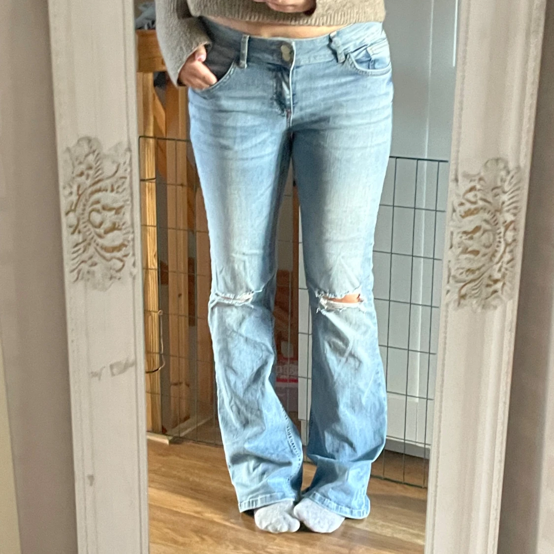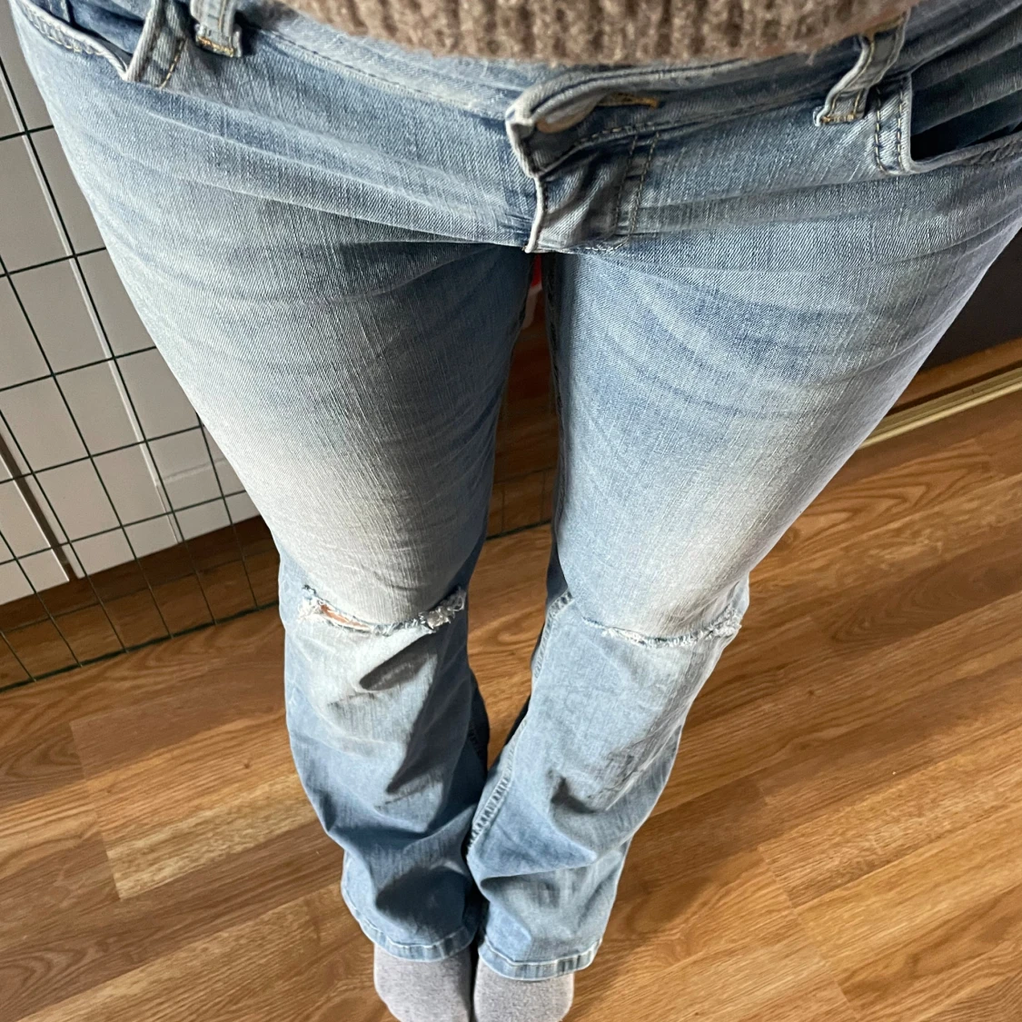 Säljer ett par ljusblå jeans med bootcut passform och slitna detaljer vid knäna. Jeansen har klassisk femficksdesign, knapp och dragkedja fram samt fickor med lock bak. Materialet är mjukt denim och midjan är normal.