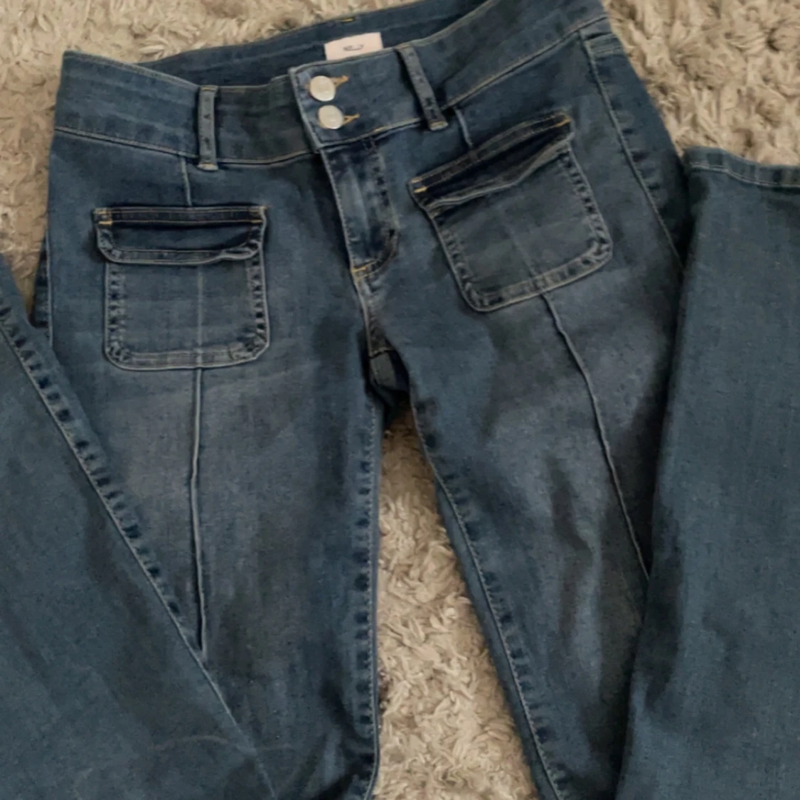 Säljer ett par blå lågmidjade jeans med gulliga fickor framtill. 💗