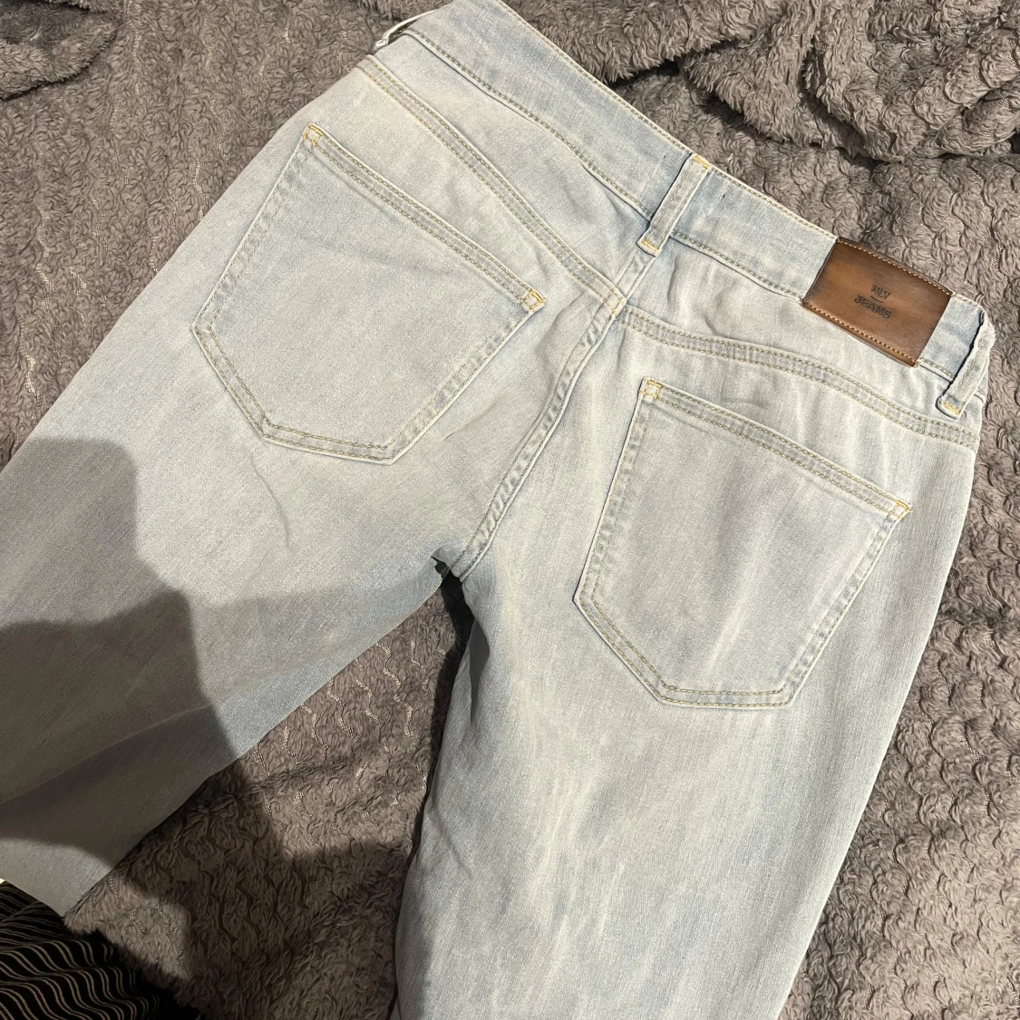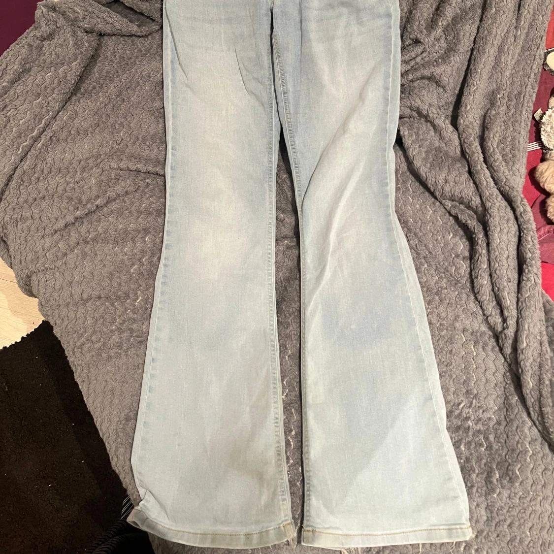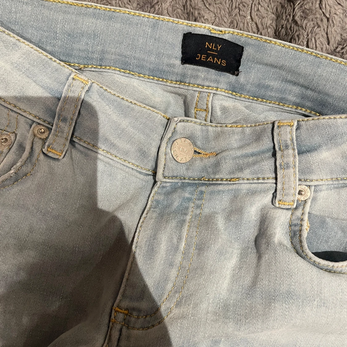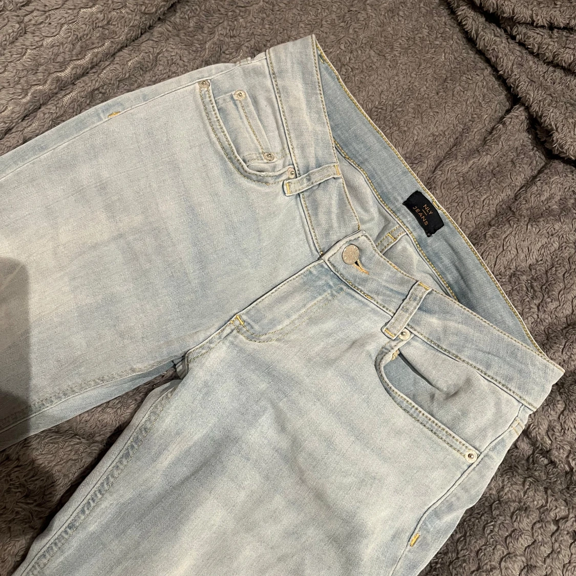 Snygga ljusblå bootcut jeans från NLY Jeans. Jag är 168 och dom passar i längden. Dom e tvärsöver midjan 36 cm.