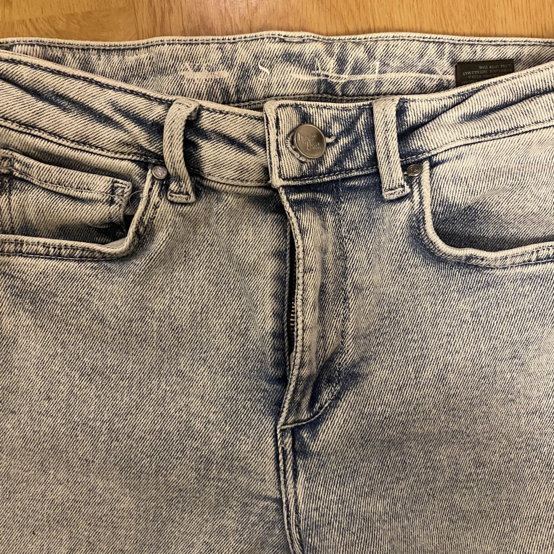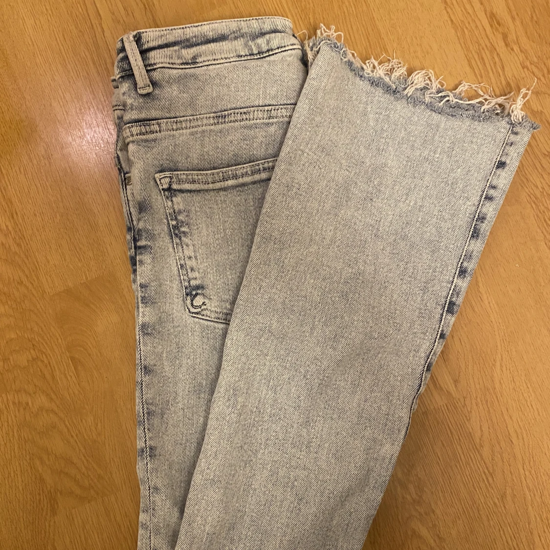 Slitna ljusblå/grå jeans med bootcut från Never Denim. Strl: Small
