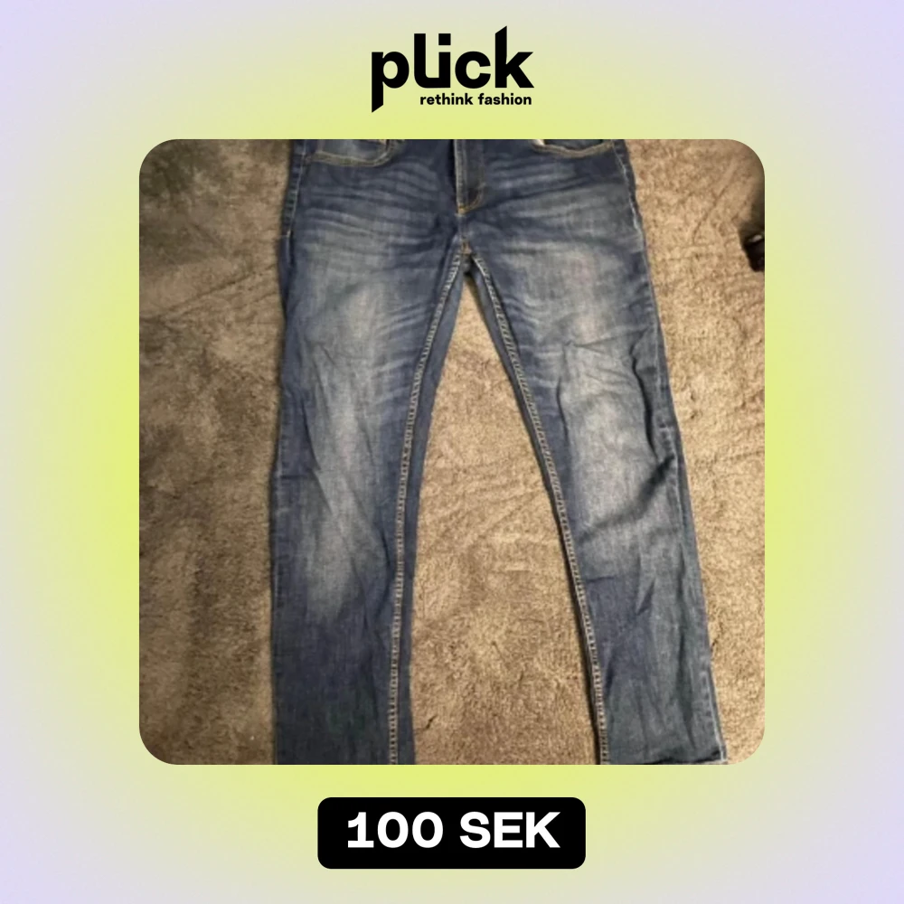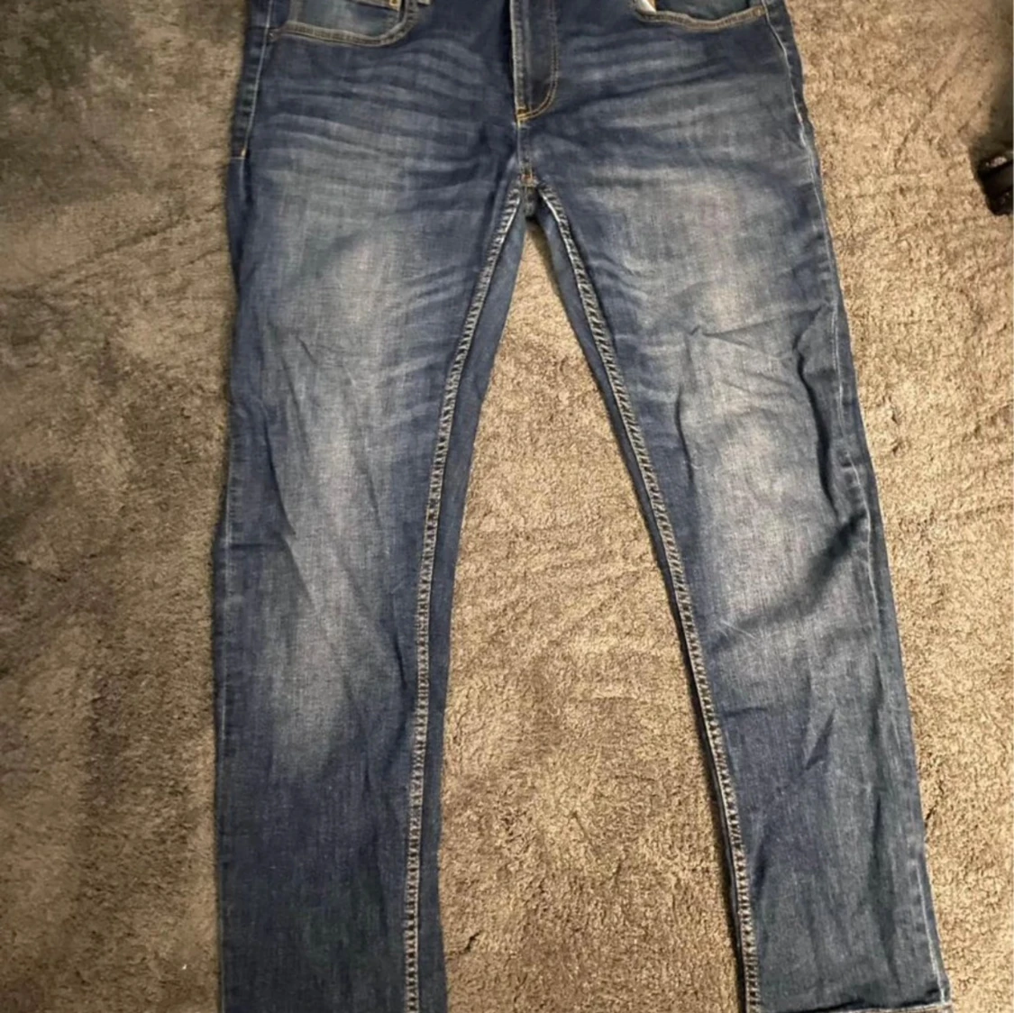 Ett par blå jeansbyxor. Byxorna har en klassisk femficksdesign och med normal passform.