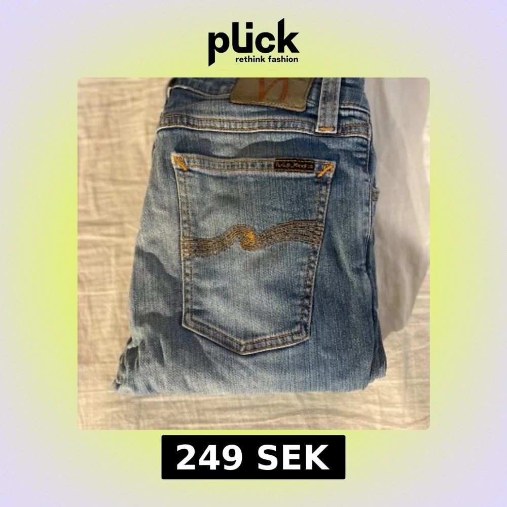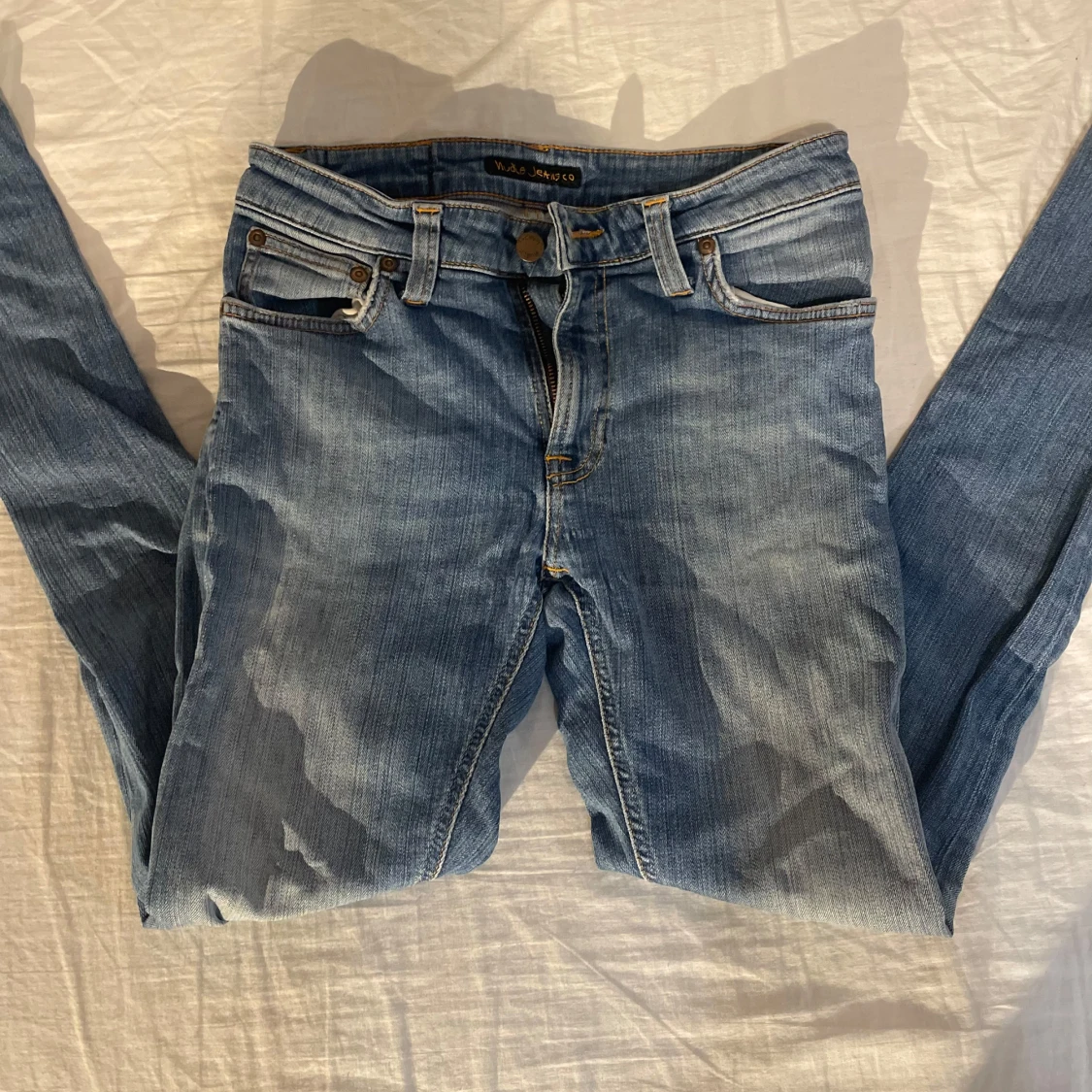 Snygga ljusblå jeans från Nudie Jeans med klassisk femficksdesign och gul kontrastsöm på bakfickan. Jeansen har smal passform och är tillverkade i mjukt denimtyg med dragkedja och knapp framtill. Perfekta för en avslappnad och trendig look.
