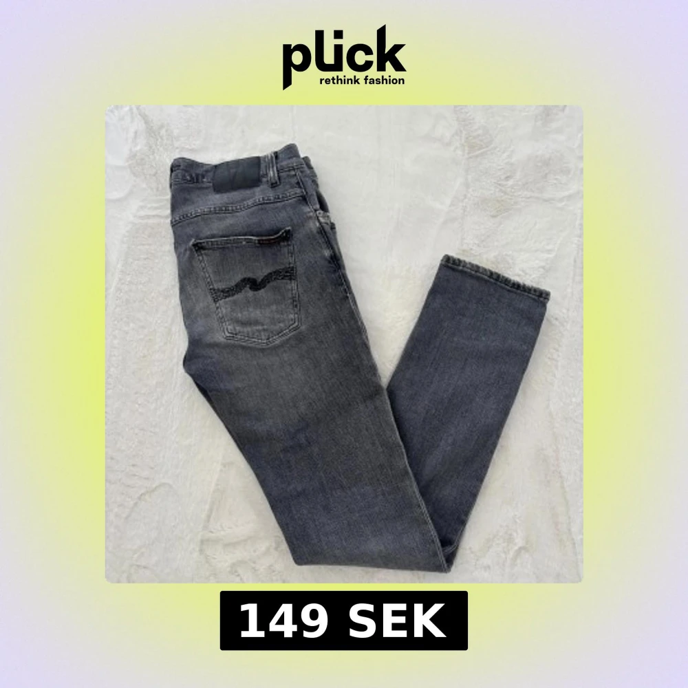 Säljer ett par Nudie Jeans Grim Tim i blekgrå tvätt. Klassisk femficksmodell med svarta sömmar på bakfickan. Jeansen är raka i modellen och tillverkade i 98% bomull och 2% elastan för lite stretch. Perfekta för dig som gillar en avslappnad men snygg look. Lagningar behövs.