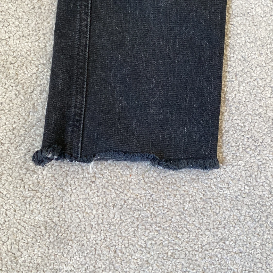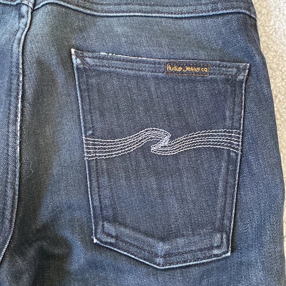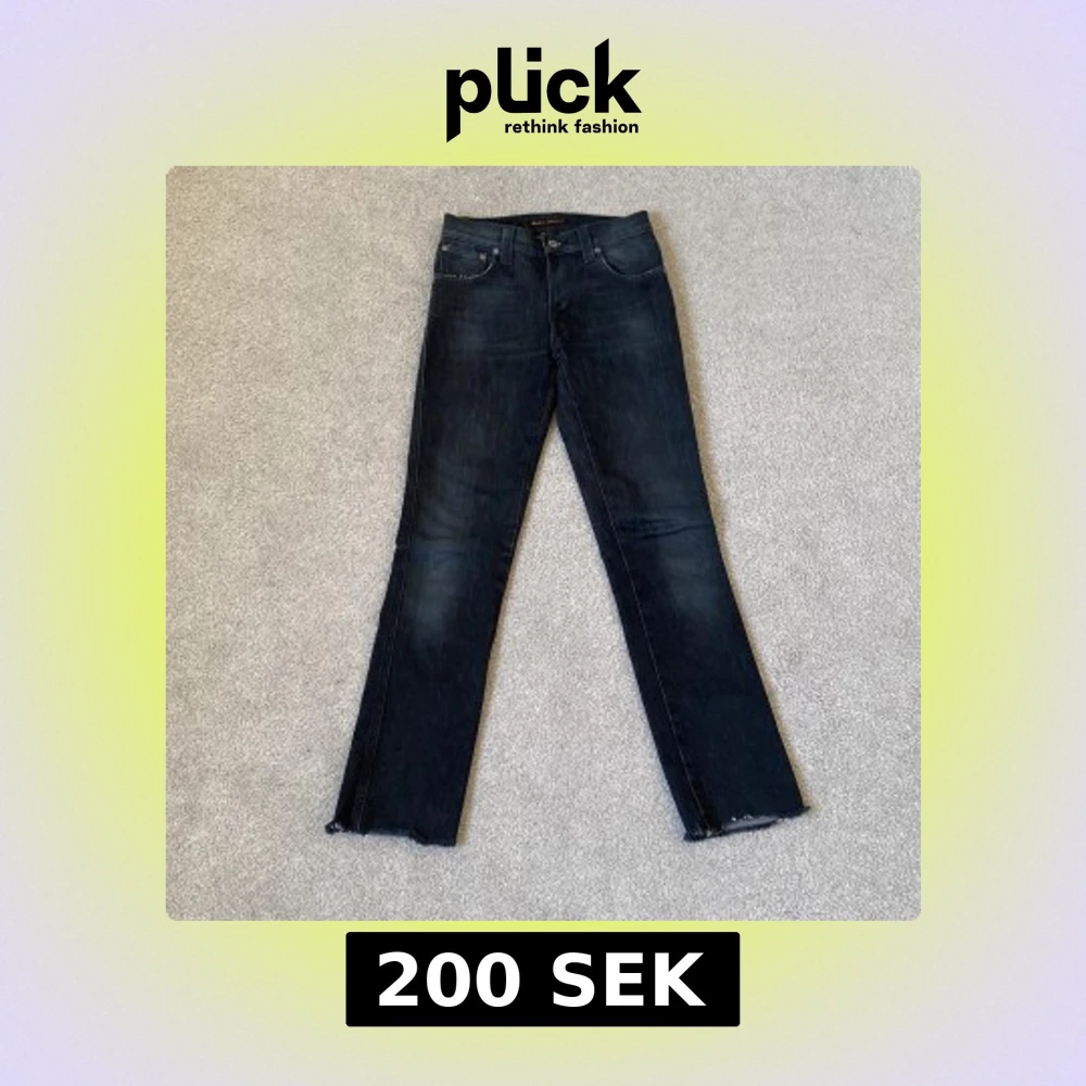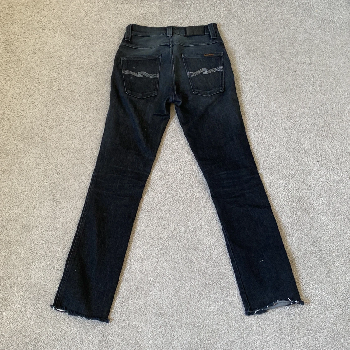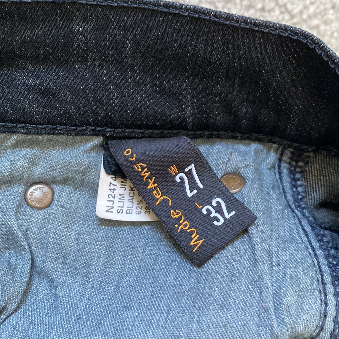 Svarta jeans från Nudie Jeans i modellen Slim Jim. Det är tydliga tecken på användning men det gör det bara snyggare! Det finns ingen ”kant” vid byxbenens slut eftersom de blivit borttagna (syns på bild). Skriv gärna vid minsta lilla fråga! 🌟