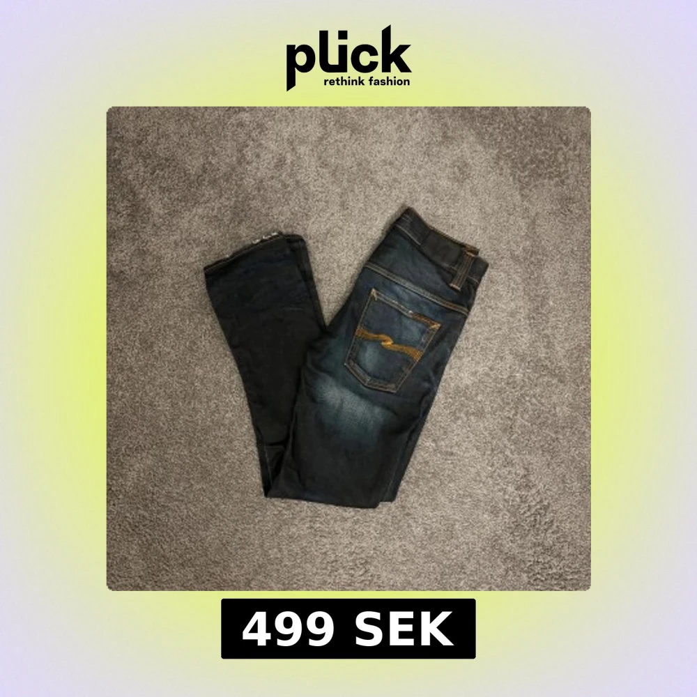 Säljer ett par mörkblå jeans från Nudie Jeans med snyggt slitna detaljer och klassiska orange sömmar. Modellen har raka ben och fem fickor, samt Nudie-loggan broderad på bakfickorna. Jeansen är i bomull och har en stilren, tidlös look.