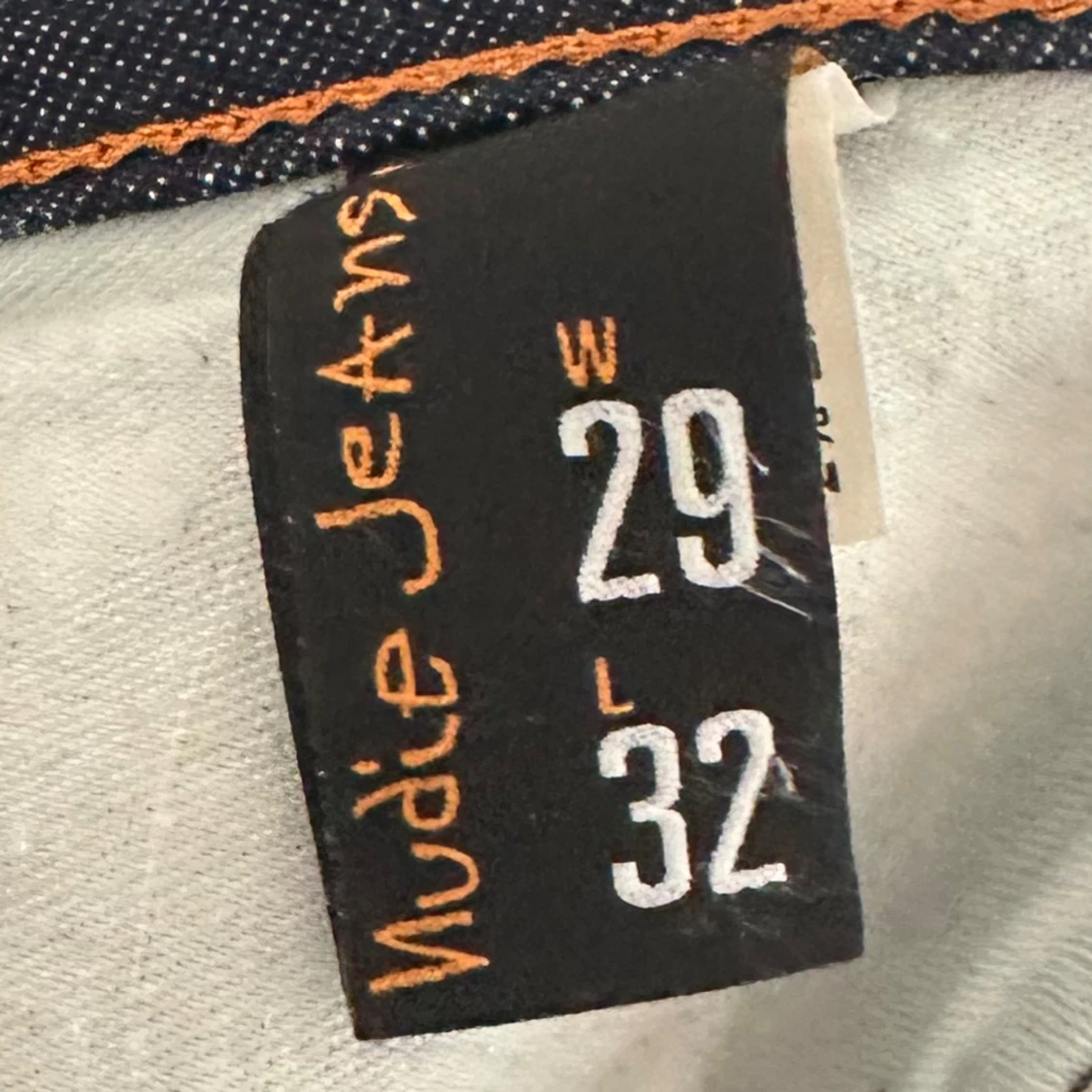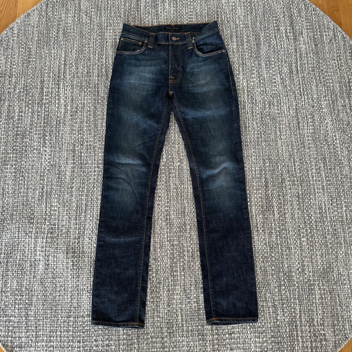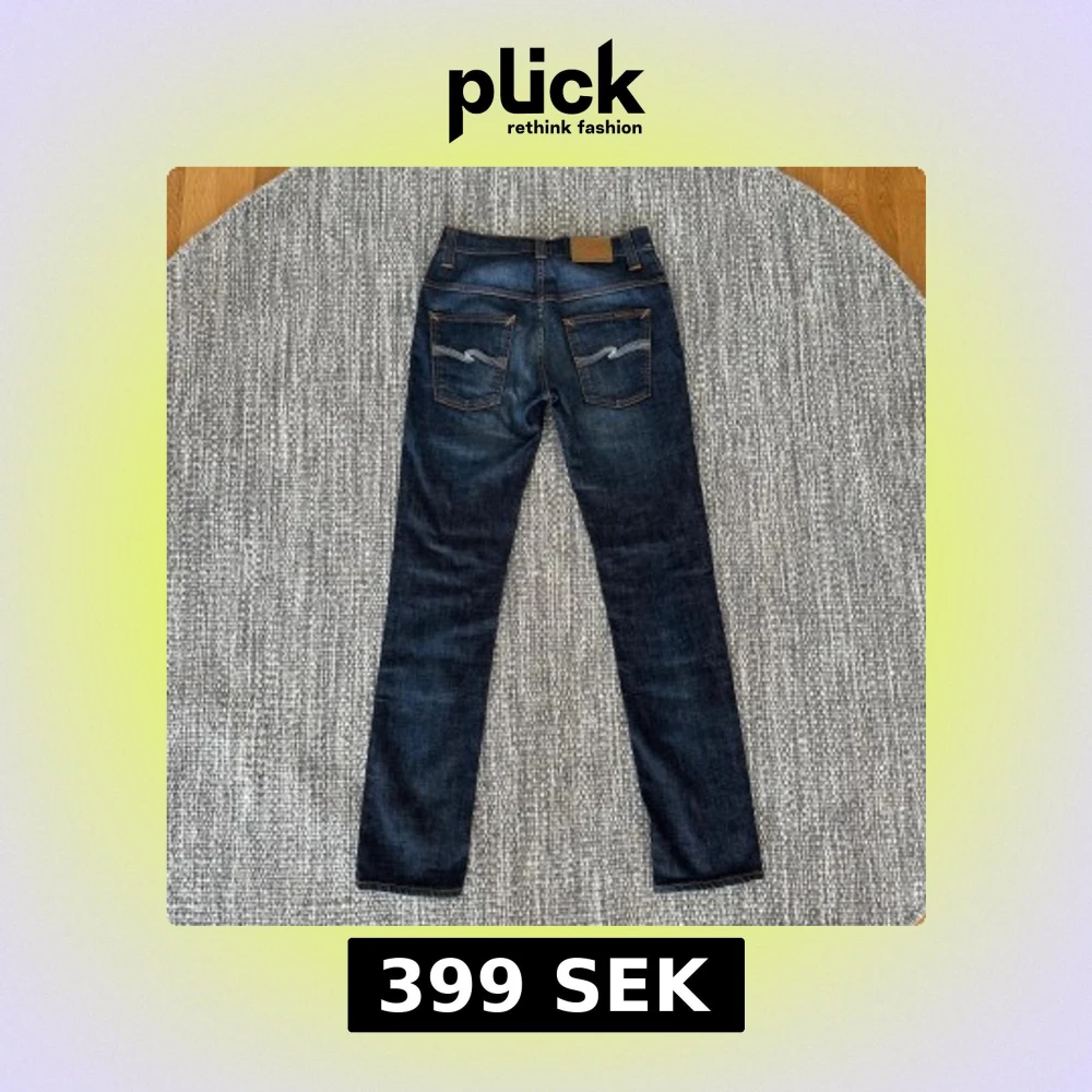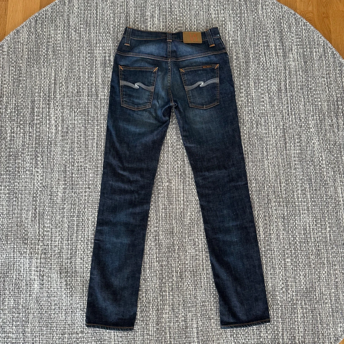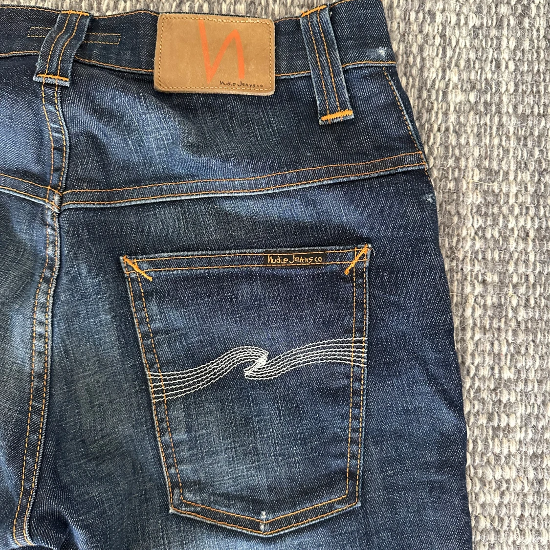 Säljer ett par mörkblå jeans från Nudie Jeans med klassisk femficksdesign och snygga kontrastsömmar. Jeansen har raka ben och coola broderade bakfickor med vågigt mönster. Tillverkade i slitstarkt denim av bomull. Perfekta för dig som gillar stilrena och tidlösa jeans.