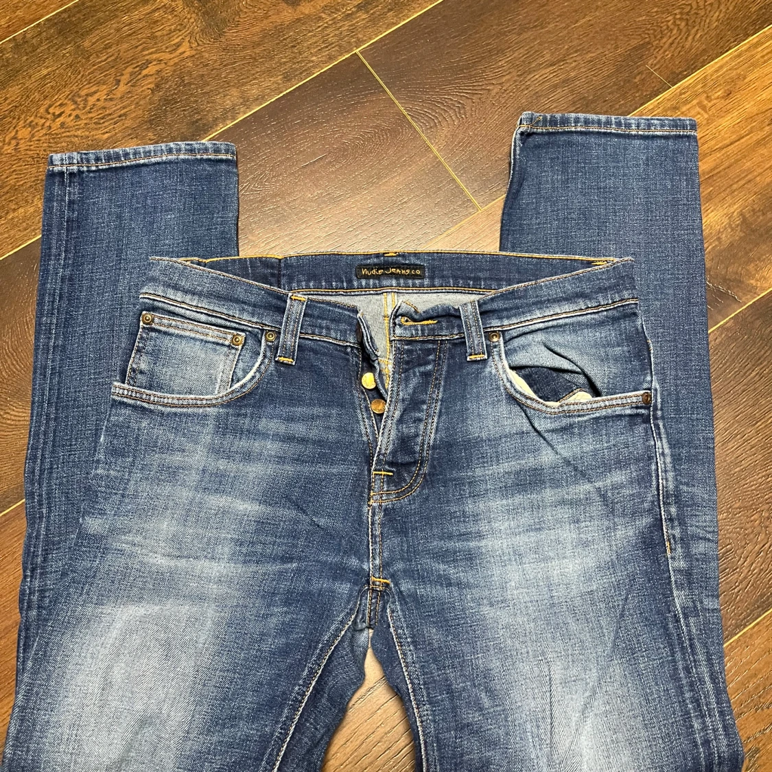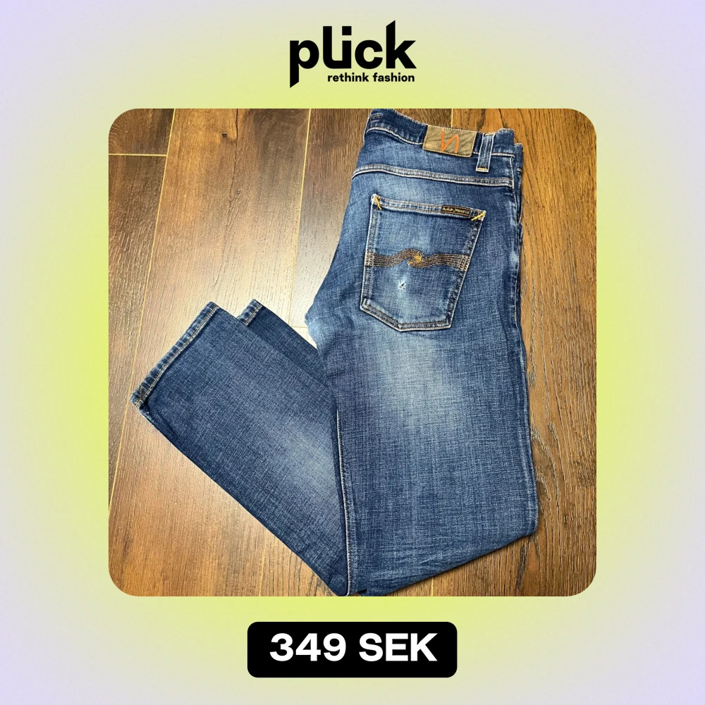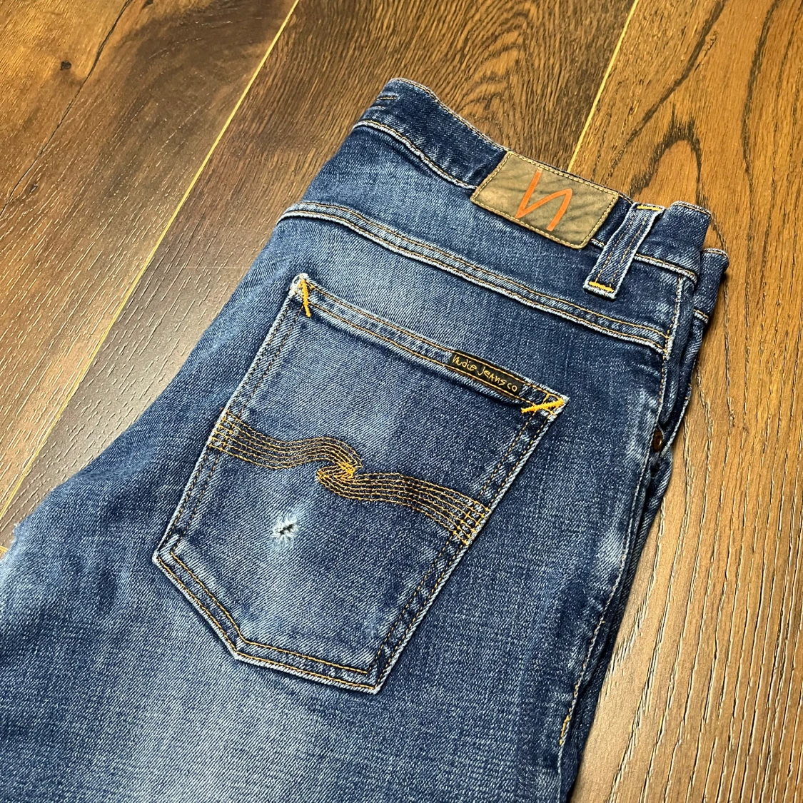 Säljer ett par snygga blå jeans från Nudie Jeans i bra skick. Storlek W32, L30. De har en klassisk femficksdesign med orange sömmar och en knappgylf. Perfekta för vardagsbruk och passar till det mesta. Obs ett litet hål i bakre ficka.
