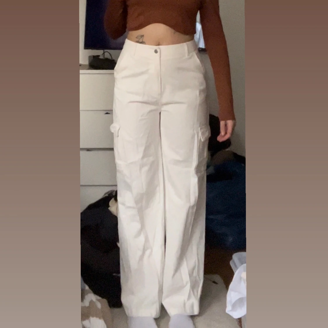Superfina byxor som känns som jeans men liknar cargo-byxor i en off-white färg. Jag är 175, det finns tyg om man vill lägga ner byxorna! Skriv för mer info! 🫶🏼