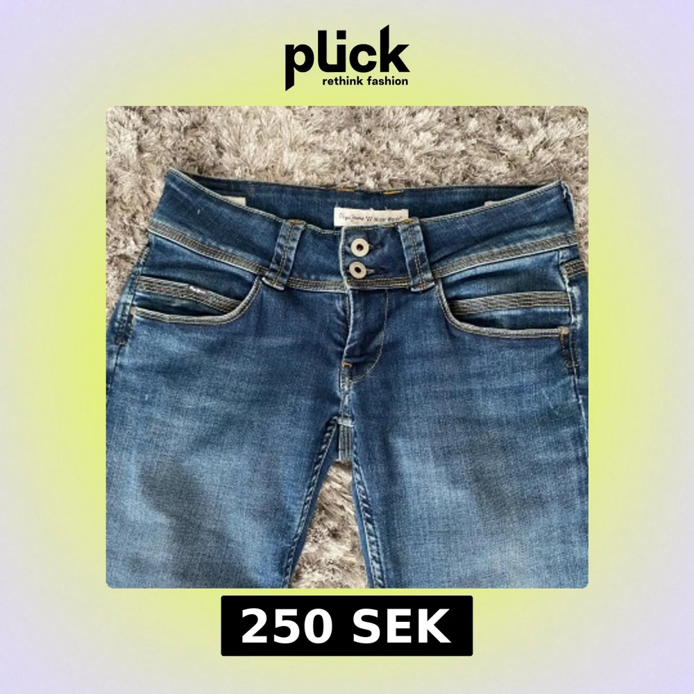 Säljer ett par blå lågmidjade jeans med dubbla knappar i midjan. Storleken är W28 och L34! Byxorna har klassiska fickor fram och ett par fina och unika fickor bak med sömmar. De är i modellen straight. Köpte på plick men har tyvärr inte använts! 💗💗