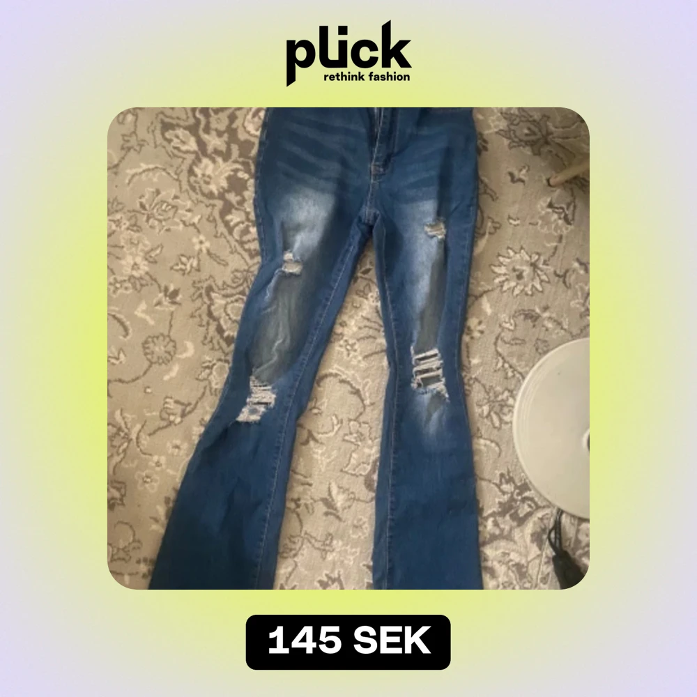 Utsvängda högmidjade jeans som är jätte fina. Dom har hål på sig enligt designen och är i storlek petite s. Jag är 160 cm och dom passar perfekt. Dom släpar inte på marken eller något