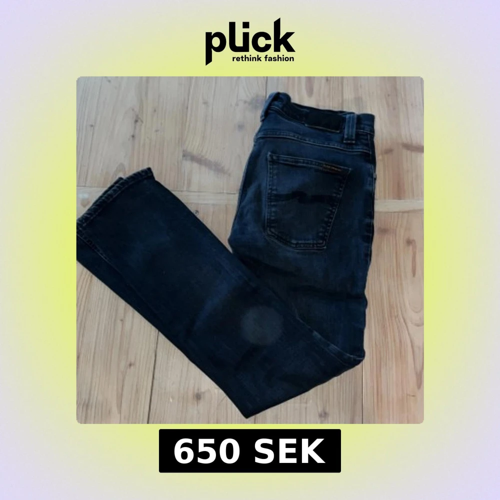 Säljer ett par svarta jeans från Nudie Jeans med klassisk femficksdesign och knappgylf. Jeansen har en snygg tvättad look och är perfekta för en avslappnad stil.