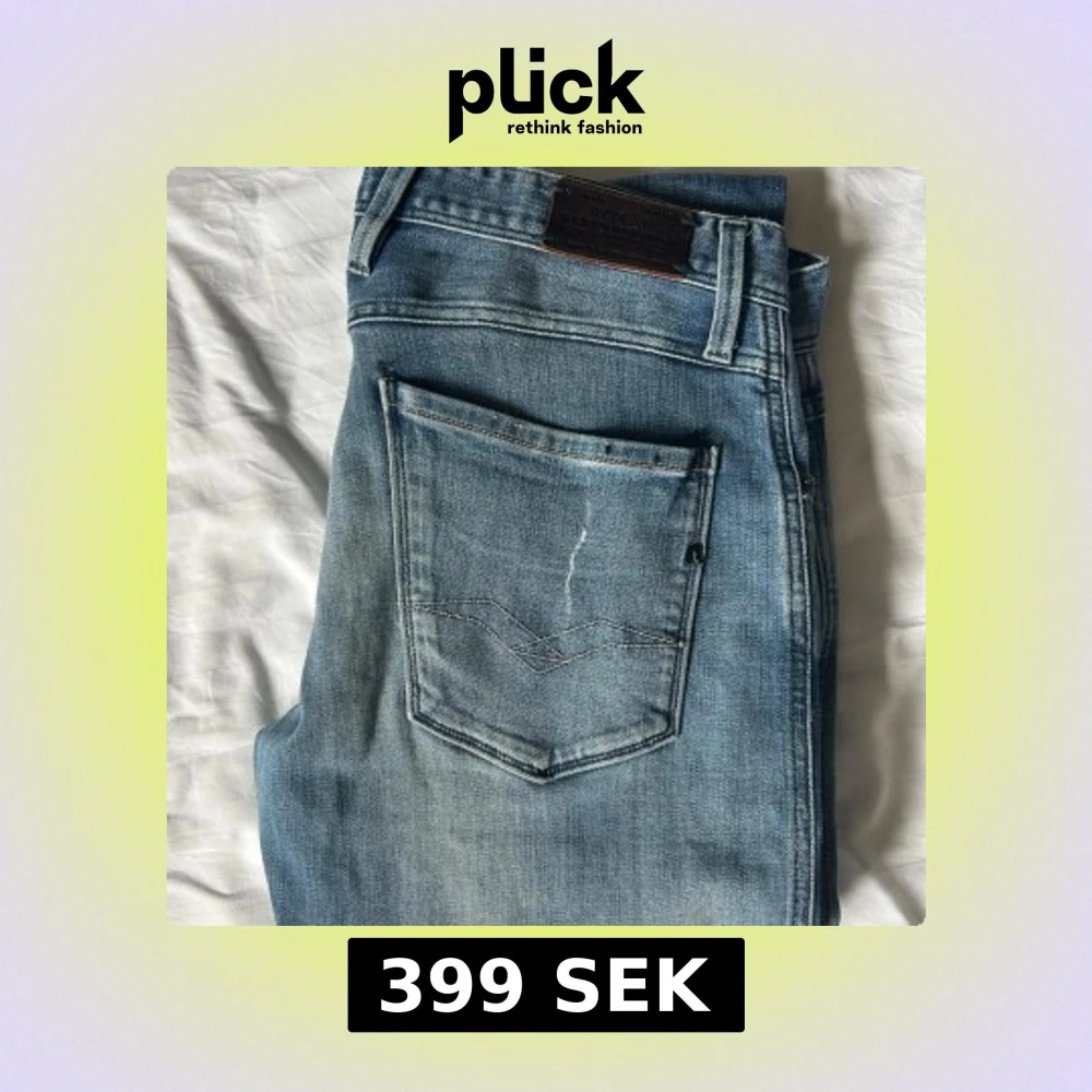 Snygga ljusblå jeans från Replay i storlek W33 och L32, passar även W32, jeansen har slitna detaljer och distressed look. Modellen har klassisk femficksdesign. Jeansen är i mjukt denimtyg och har Replay-logga på bakfickan. Perfekta för en avslappnad streetstil.