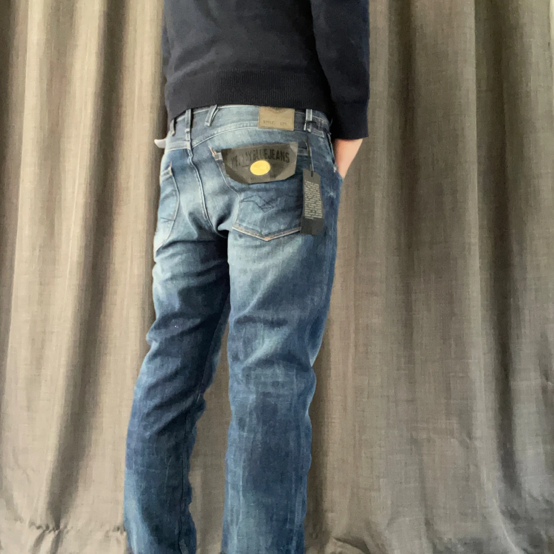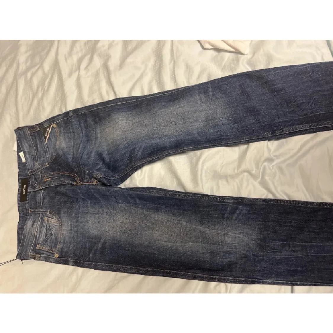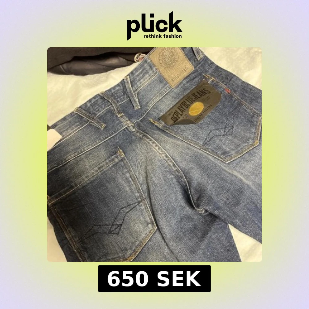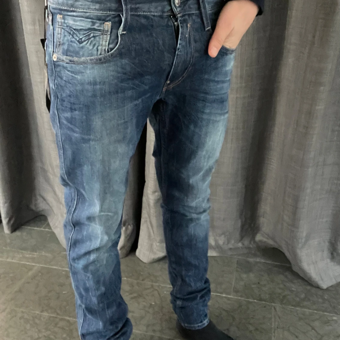 Säljer ett par Replay Anbass Jeans med klassisk femficksdesign met jävligt fet tvätt. Jeansen är blå med ljusare tvättade partier, har raka ben och normal passform. Materialet är robust denim med Replay-logga på bakfickan och läderpatch i midjan. Jeansen är helt nya och aldrig använda med alla lappar kvar. Jensen är storlek 28/32