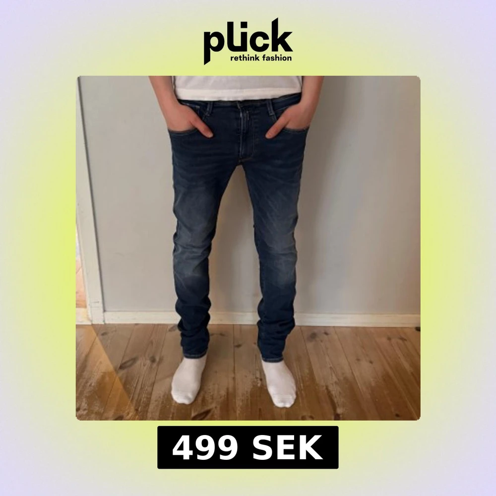 Snygga blå jeans från Replay i modellen Anbass. De har en slim passform och är tillverkade i jeansmaterial. Byxorna har klassisk femficksdesign och stängs med dragkedja och knapp. Perfekta för en stilren look. Aldrig använda och helt nya. Modellen är 180cm