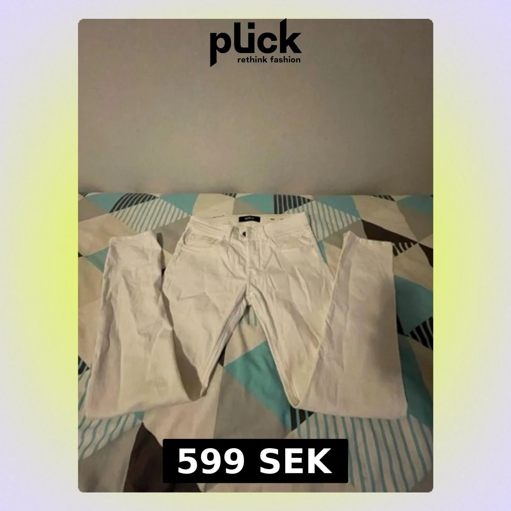 Säljer ett par fräscha vita jeans från Replay i storlek 29/30. Klassisk femficksmodell med raka ben och normal passform. Snyggt blått Replay-märke baktill. Perfekta för dig som gillar stilrena och ljusa jeans. Använda ett par gånger. Pris kan diskuteras.