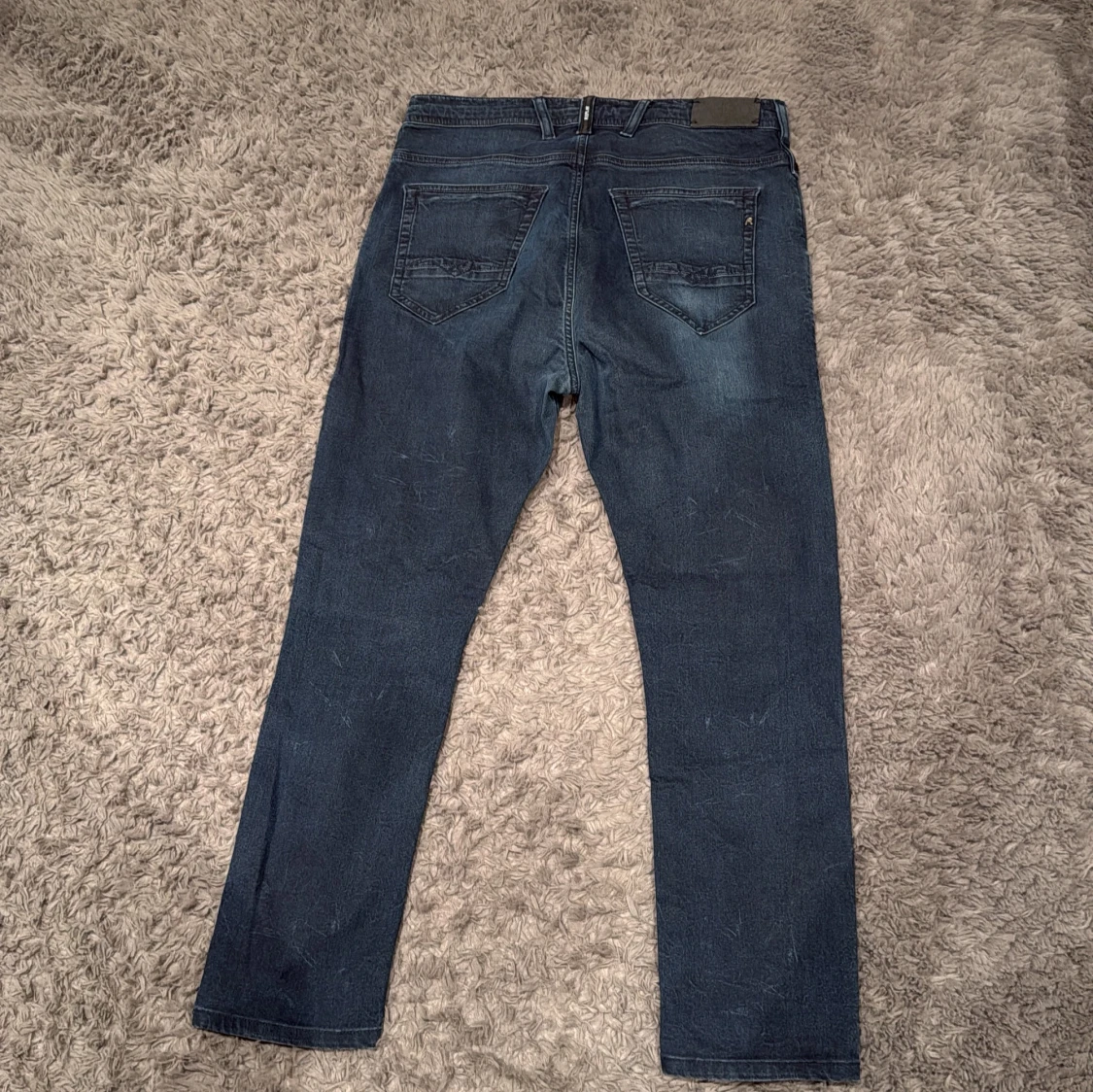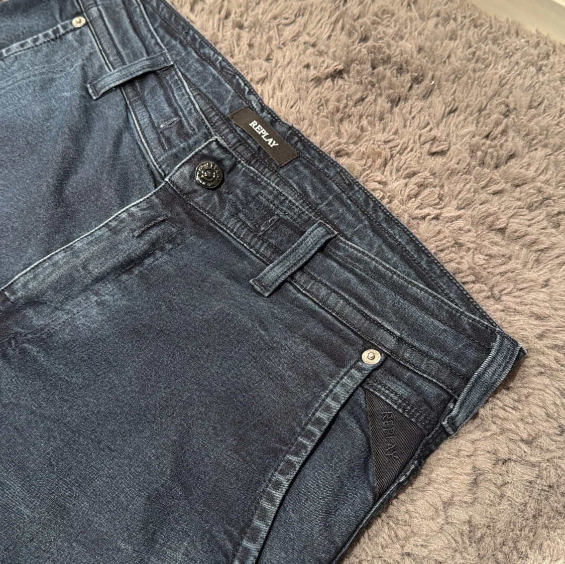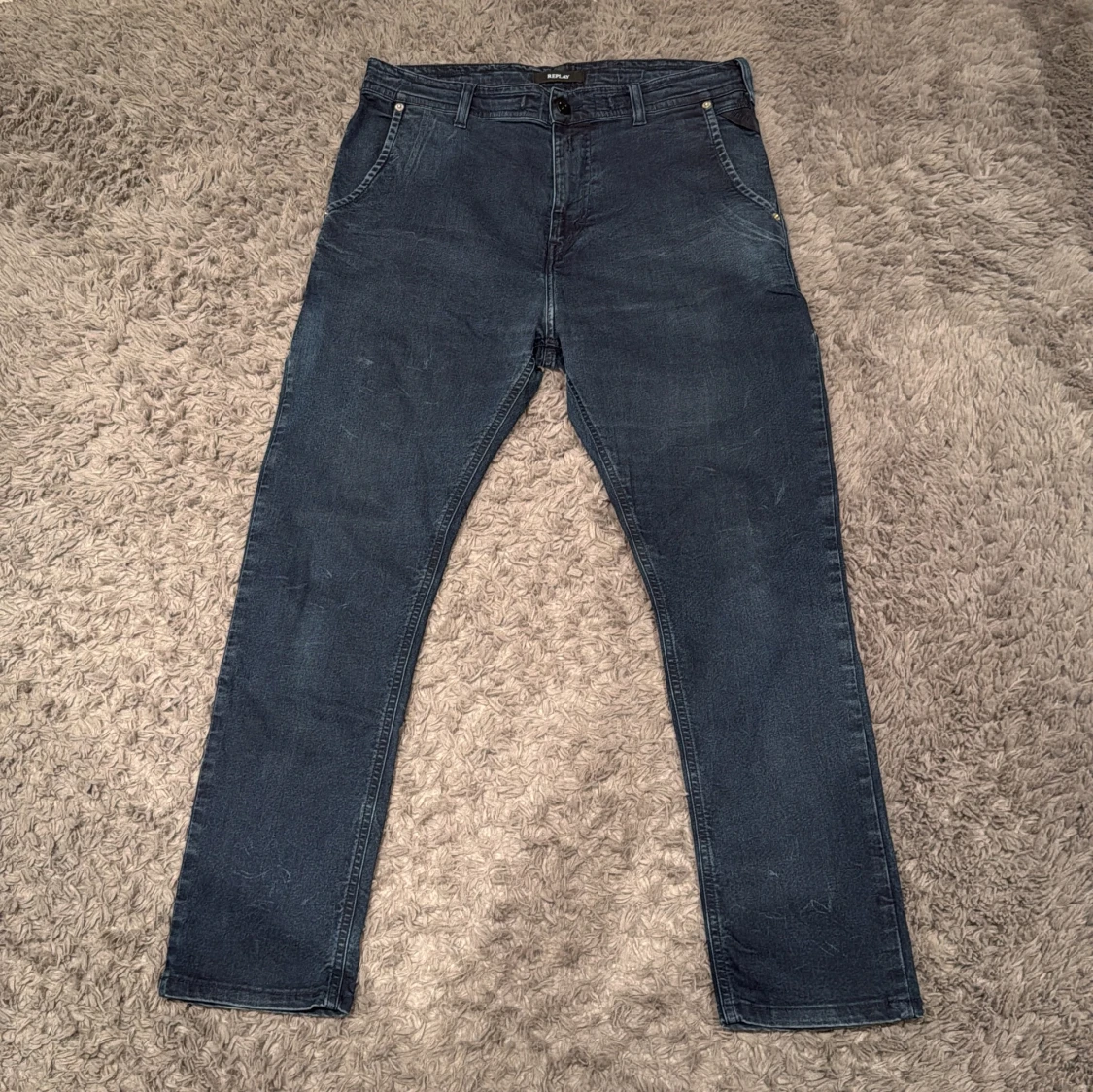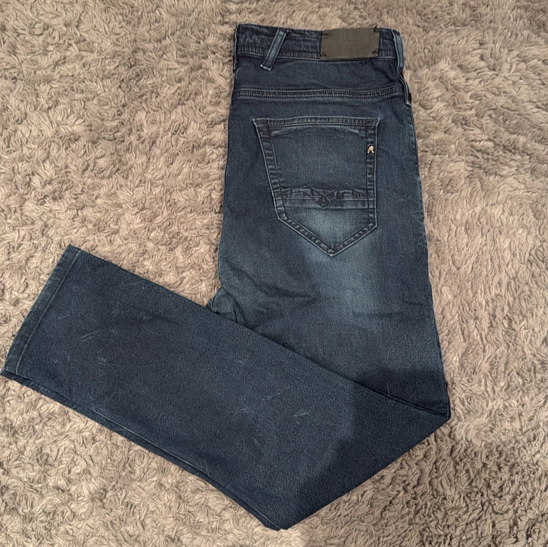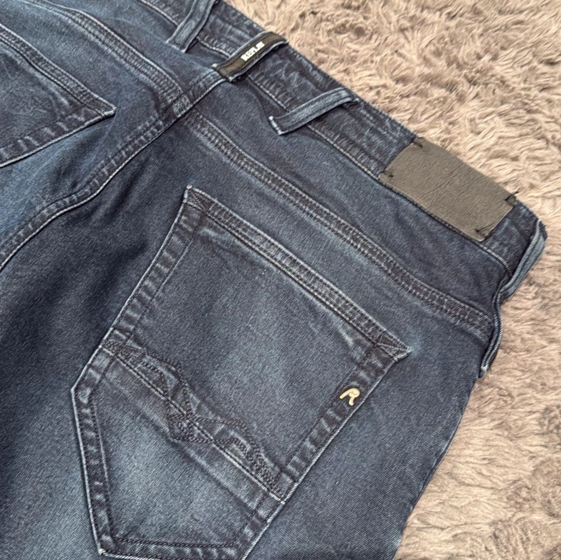 Snygga mörkblå jeans från Replay med klassisk femficksdesign. De har en knappgylf och bälteshällor. Perfekta för en stilren look. Riktigt feta med extra detaljer. Först till kvarn! Storlek L27 W30