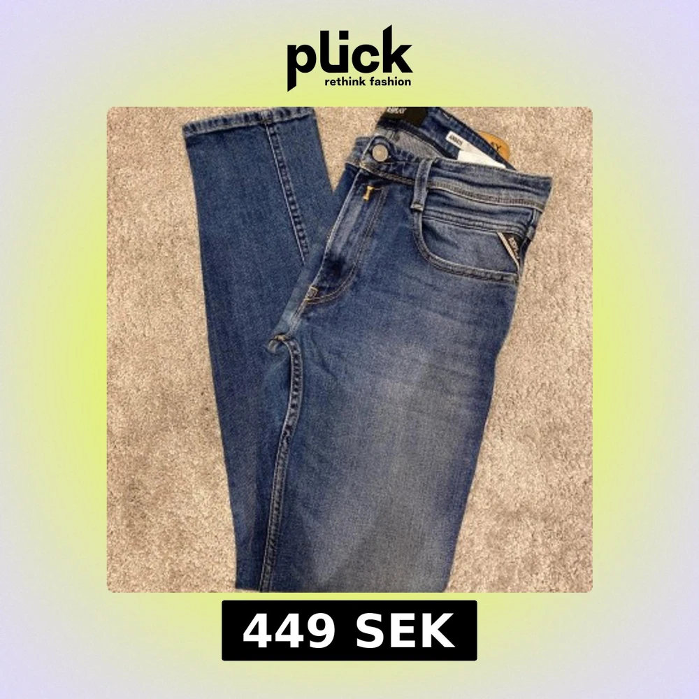 Säljer ett par blå Replay Anbass jeans med snygg tvätt och klassiska detaljer. Jeansen har fem fickor, dragkedja och smal passform som sitter tajt längs benen. Märkeslogga på fickan och bakficka med dekorativ söm. Perfekta för en stilren och modern look.