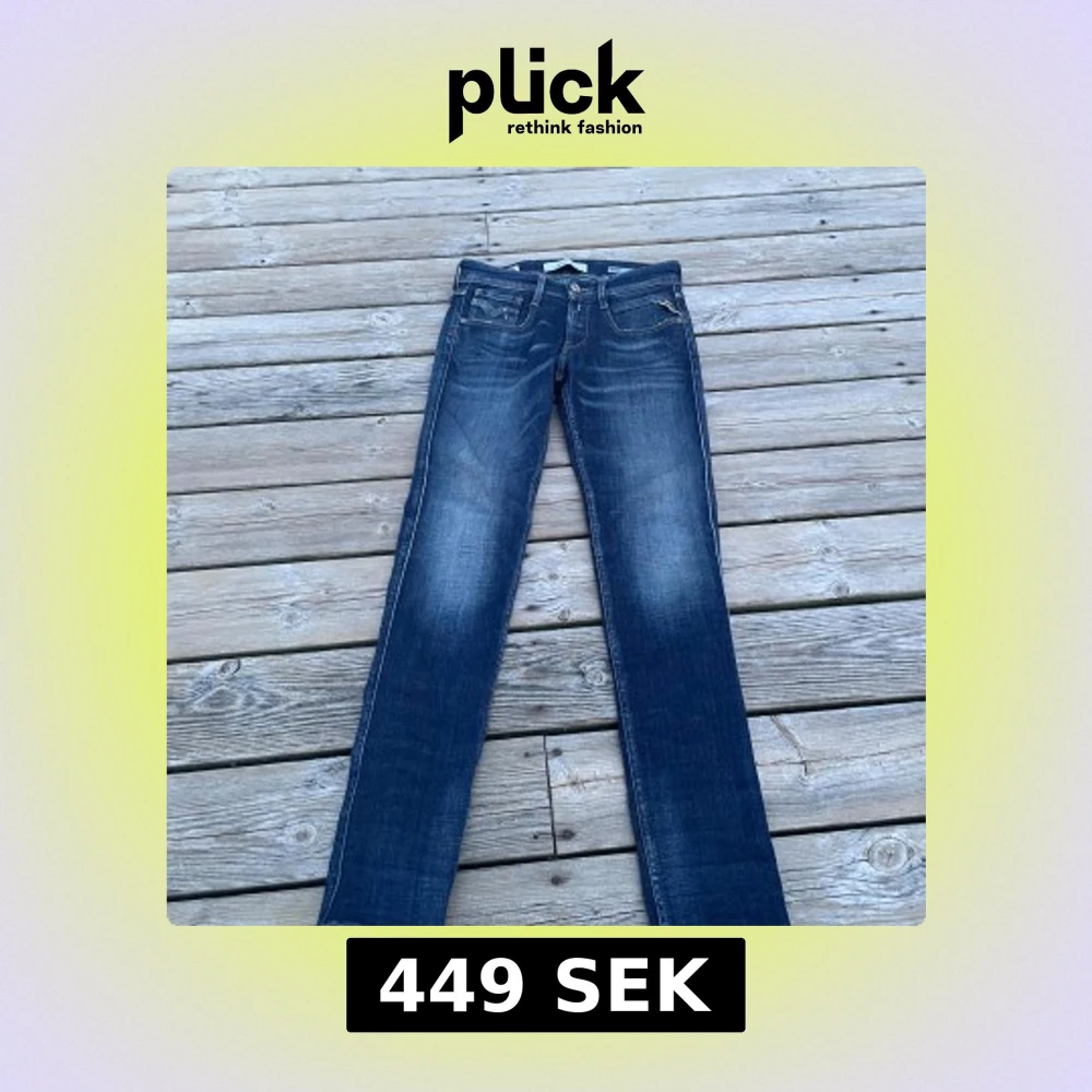 Säljer ett par klassiska blå jeans från Replay med slim passform och snygga slitningar framtill. Jeansen har fem fickor, dragkedja och knapp i midjan samt detaljerade bakfickor. Tillverkade i hållbar bomull.