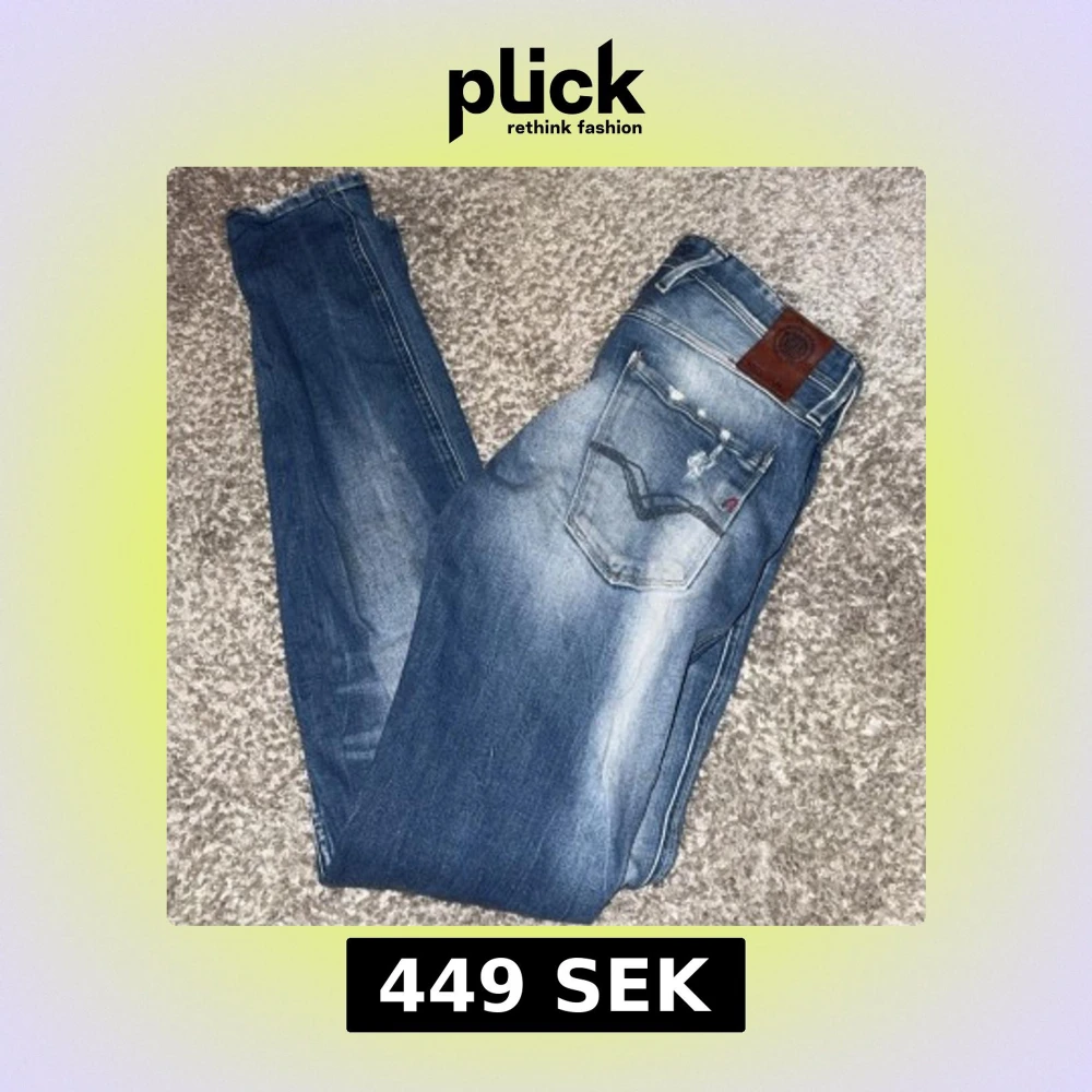 Säljer ett par Replay Anbass jeans i blå tvätt med snygga slitningar och detaljer. Jeansen har klassisk femficksdesign, läderpatch bak och smal passform. Perfekt för dig som gillar en cool och modern look.