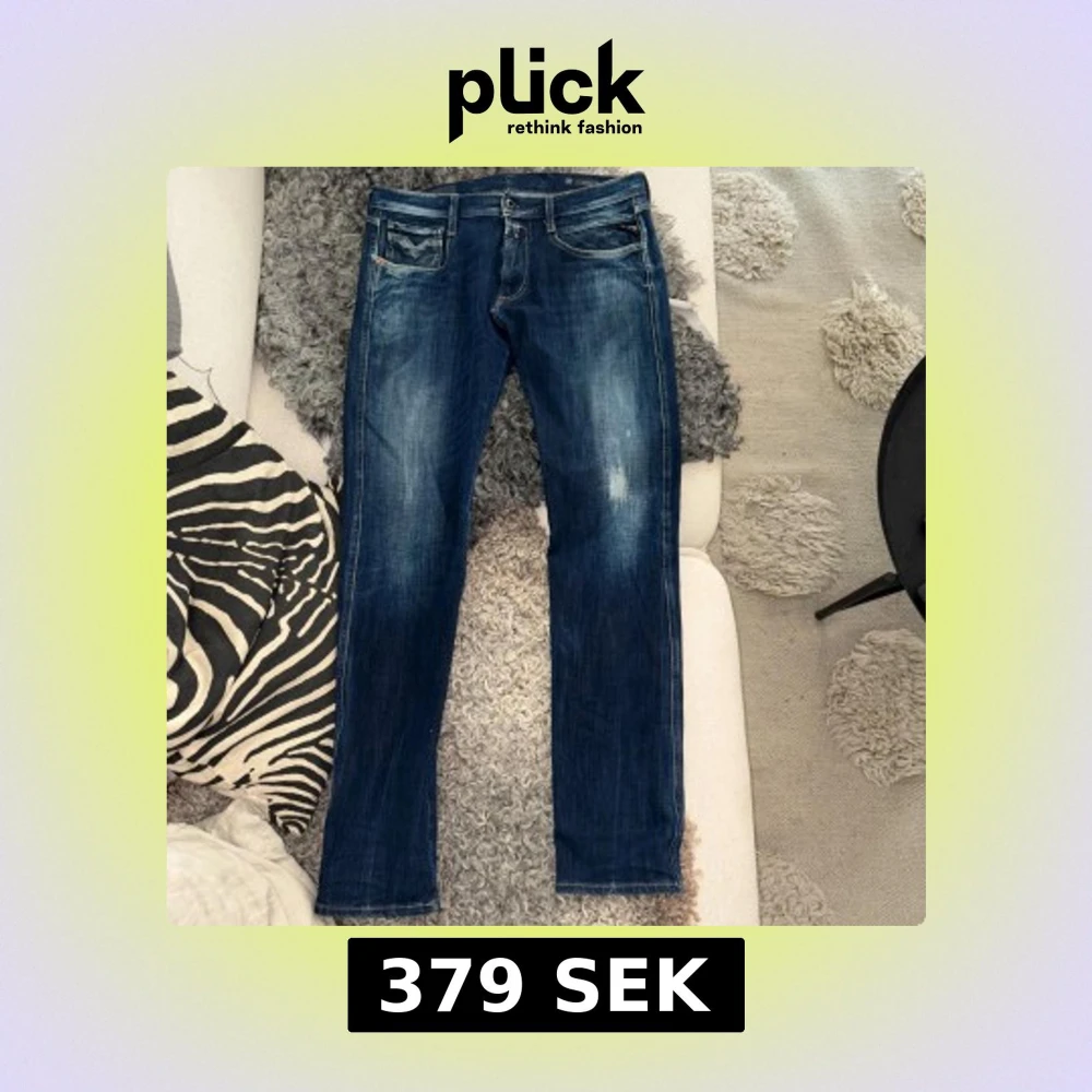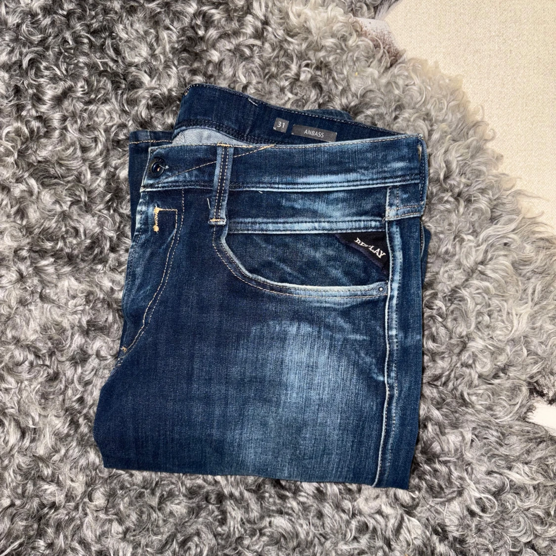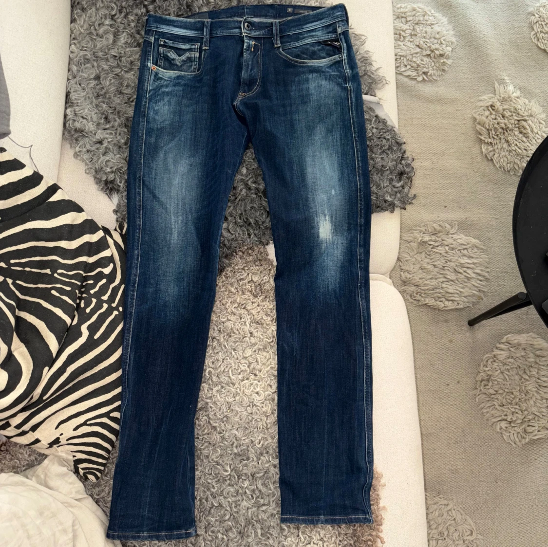Snygga blå jeans från Replay med en klassisk femficksdesign och lätt slitna detaljer. Flexfit. Storleken är 31-34, passar dig som är 170-175