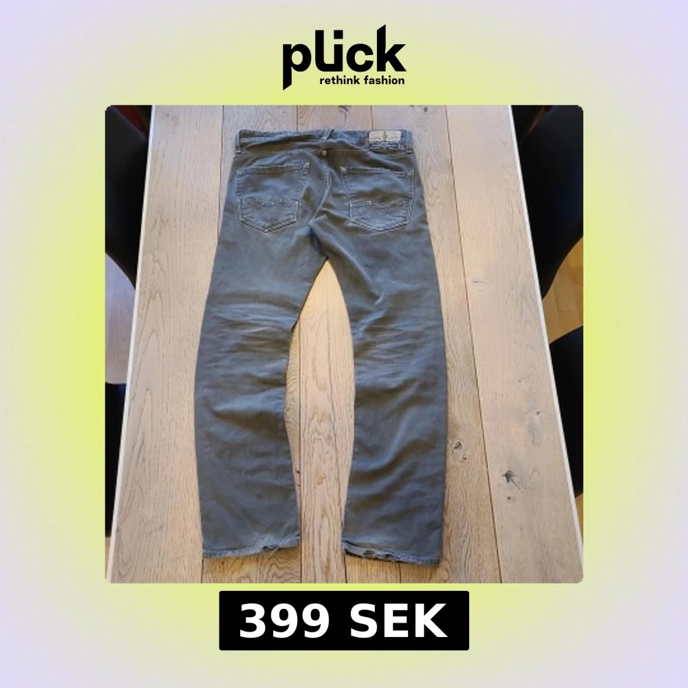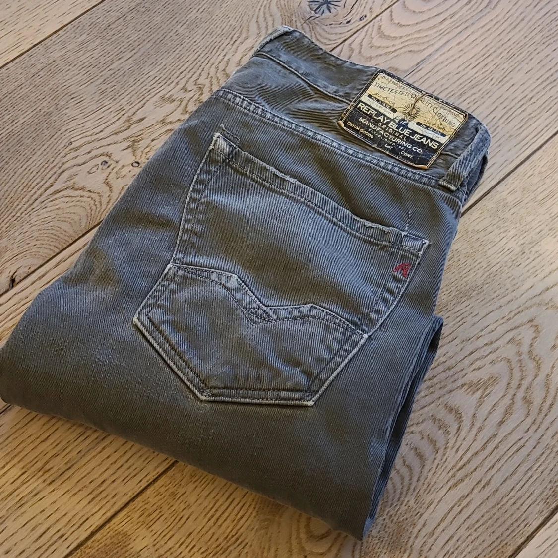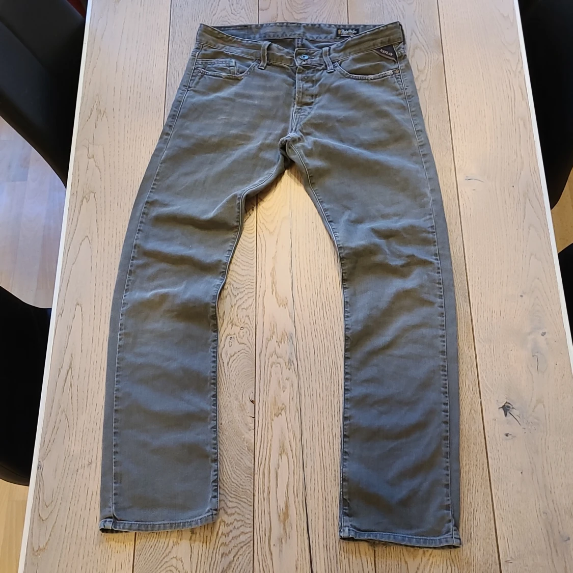 Säljer ett par grå jeansbyxor från Replay i klassisk rak modell. Byxorna har fem fickor, dragkedja och knapp i midjan samt Replay-märke på bakfickan. Midjemått W31 och längd L32.