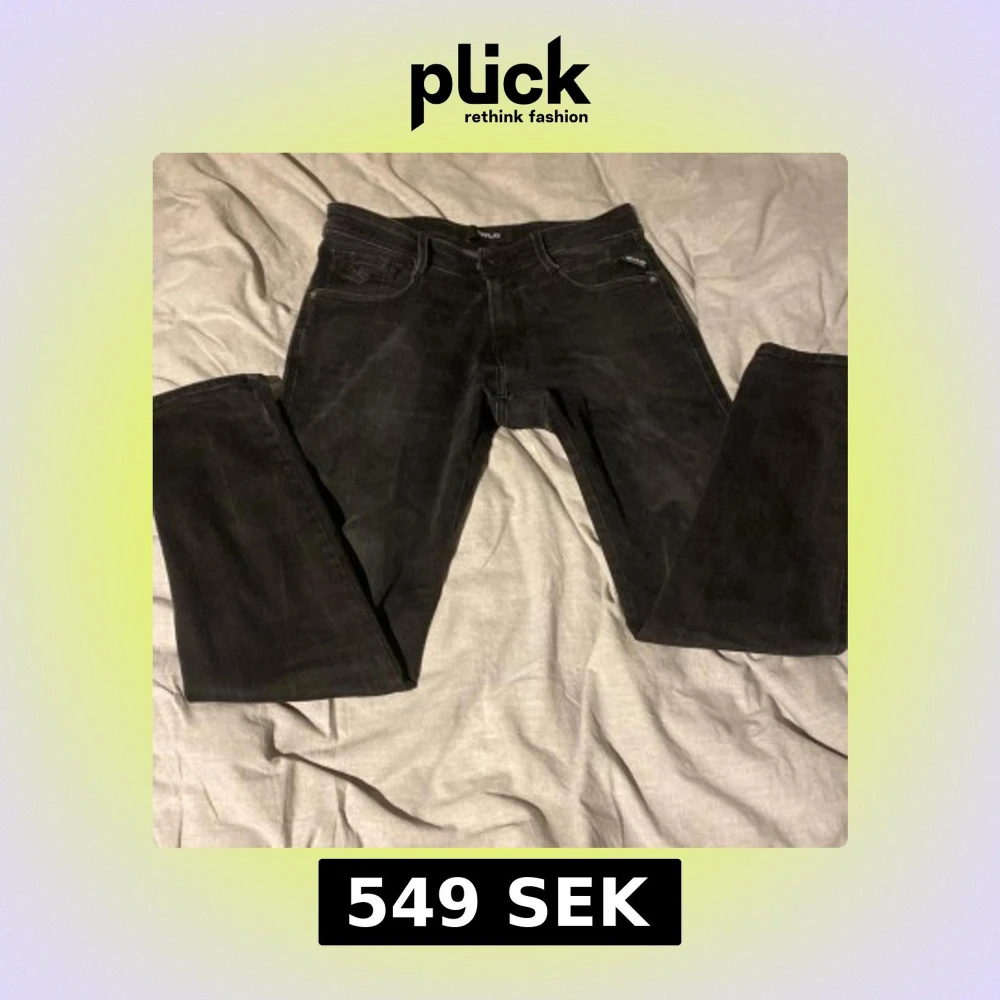 Snygga svarta jeans från Replay, modell Anbass. De har en klassisk femficksdesign med dragkedja och knapp framtill. Perfekta för en stilren look. De har blivit uppsydda så sitter mer som mellan 28 och 30 på längden.