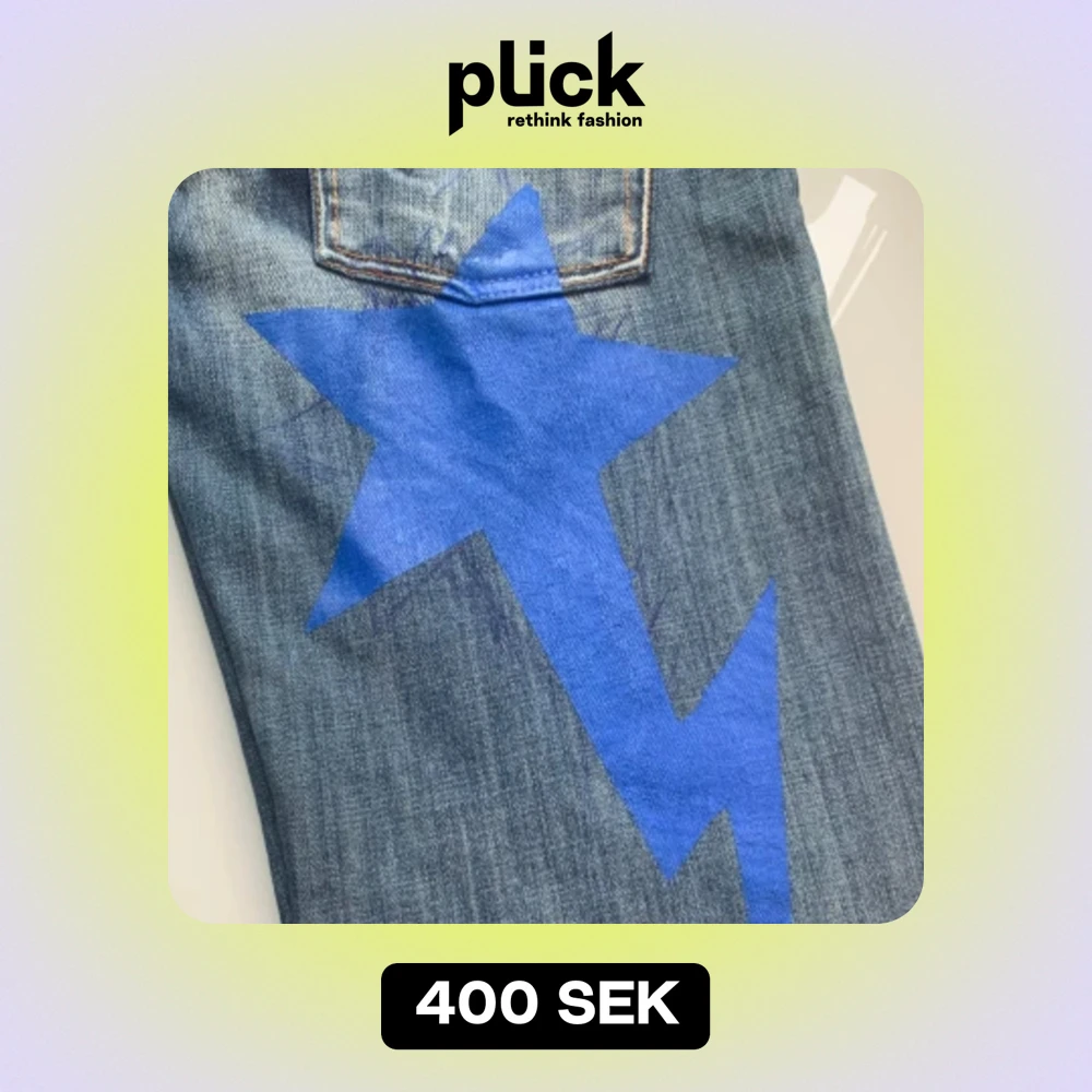 Storlek 158! đJeans med blĂ„a stjĂ€rnor pĂ„ baksidan av benen. StjĂ€rnorna Ă€r mĂ„lade sjĂ€lv! LĂ„g midjade y2k byxor. Det finns fĂ„r blĂ€ck strĂ€ck pĂ„ baksidan pĂ„ ena benet. Ăndarna pĂ„ benen Ă€r lite slitna, se pĂ„ bild.đ